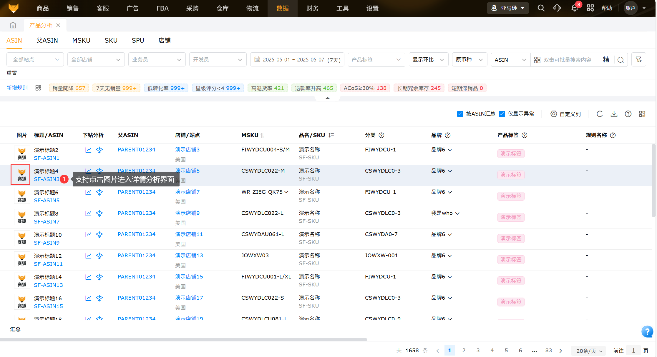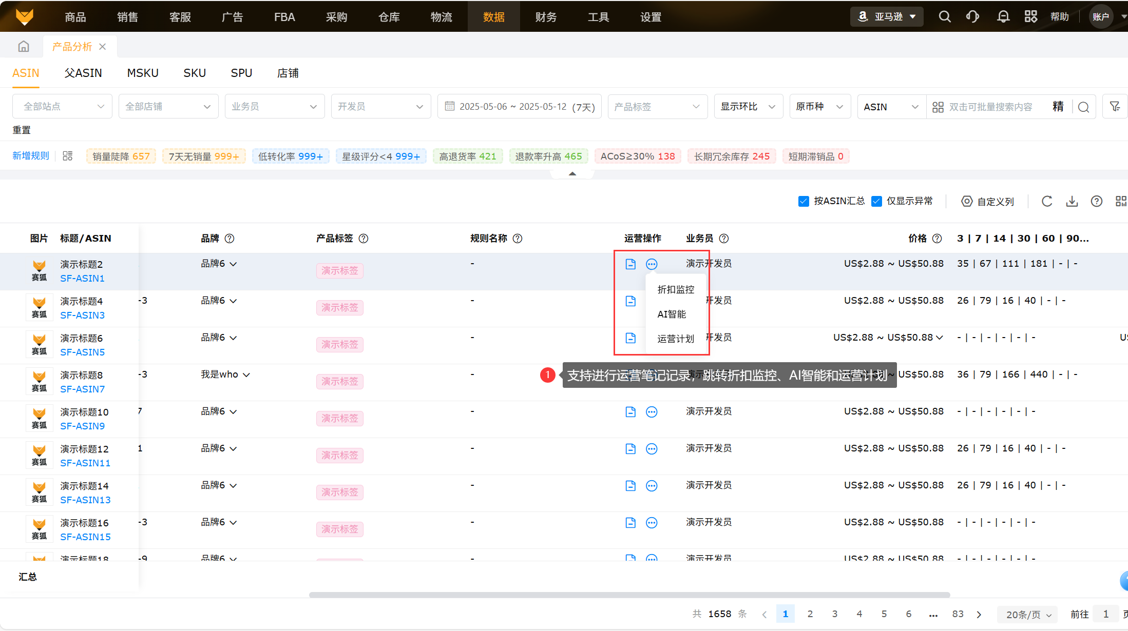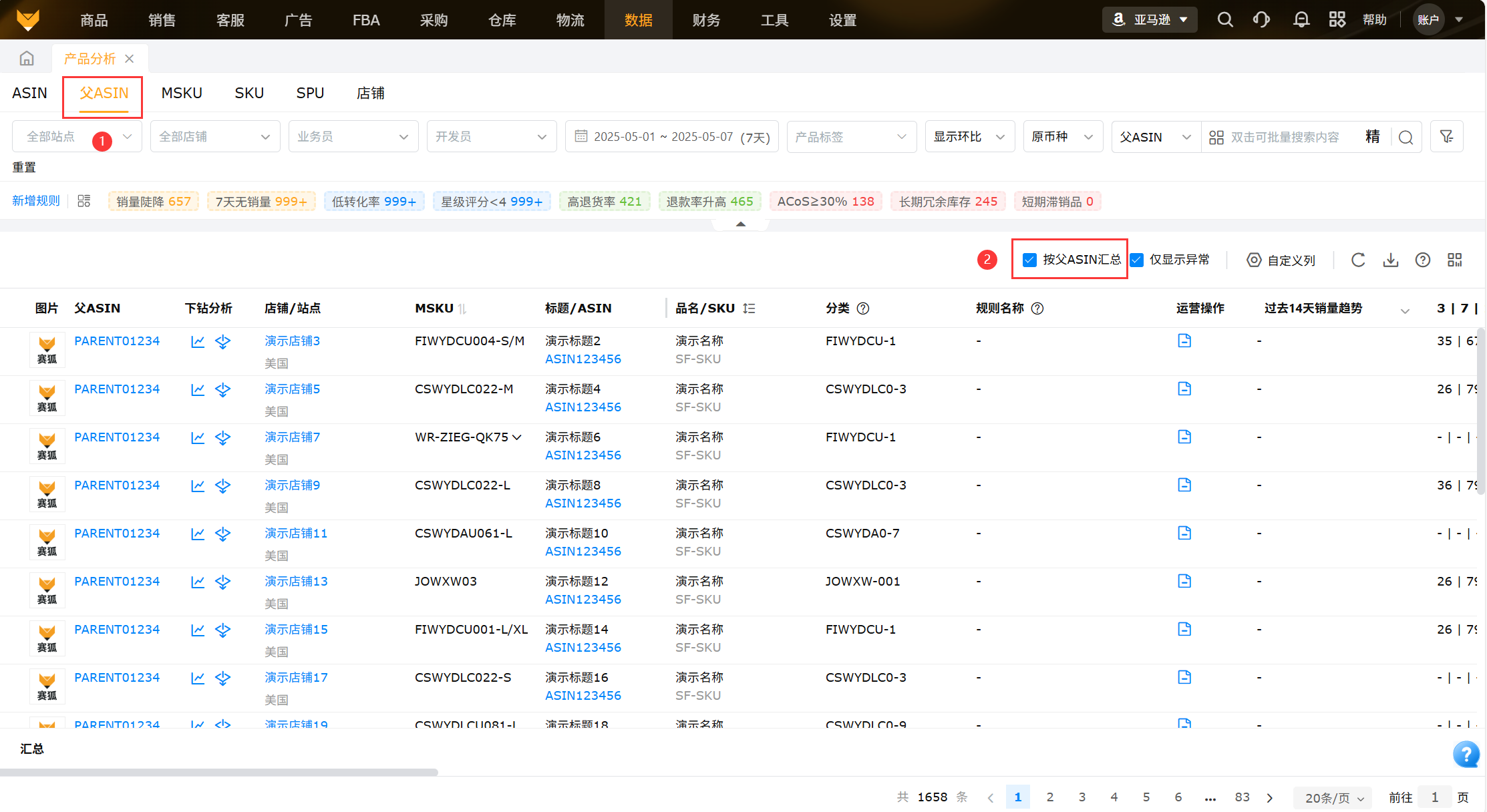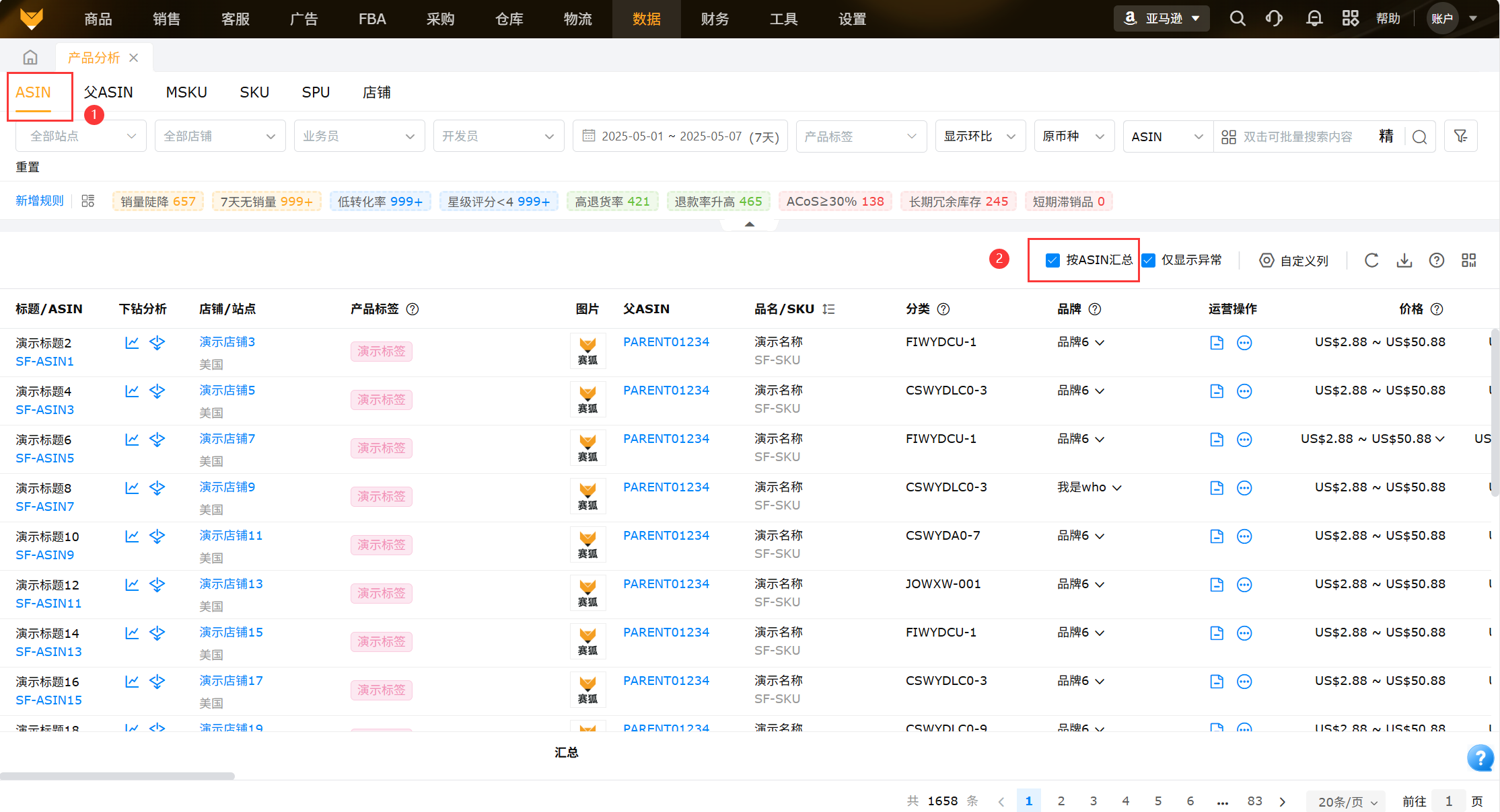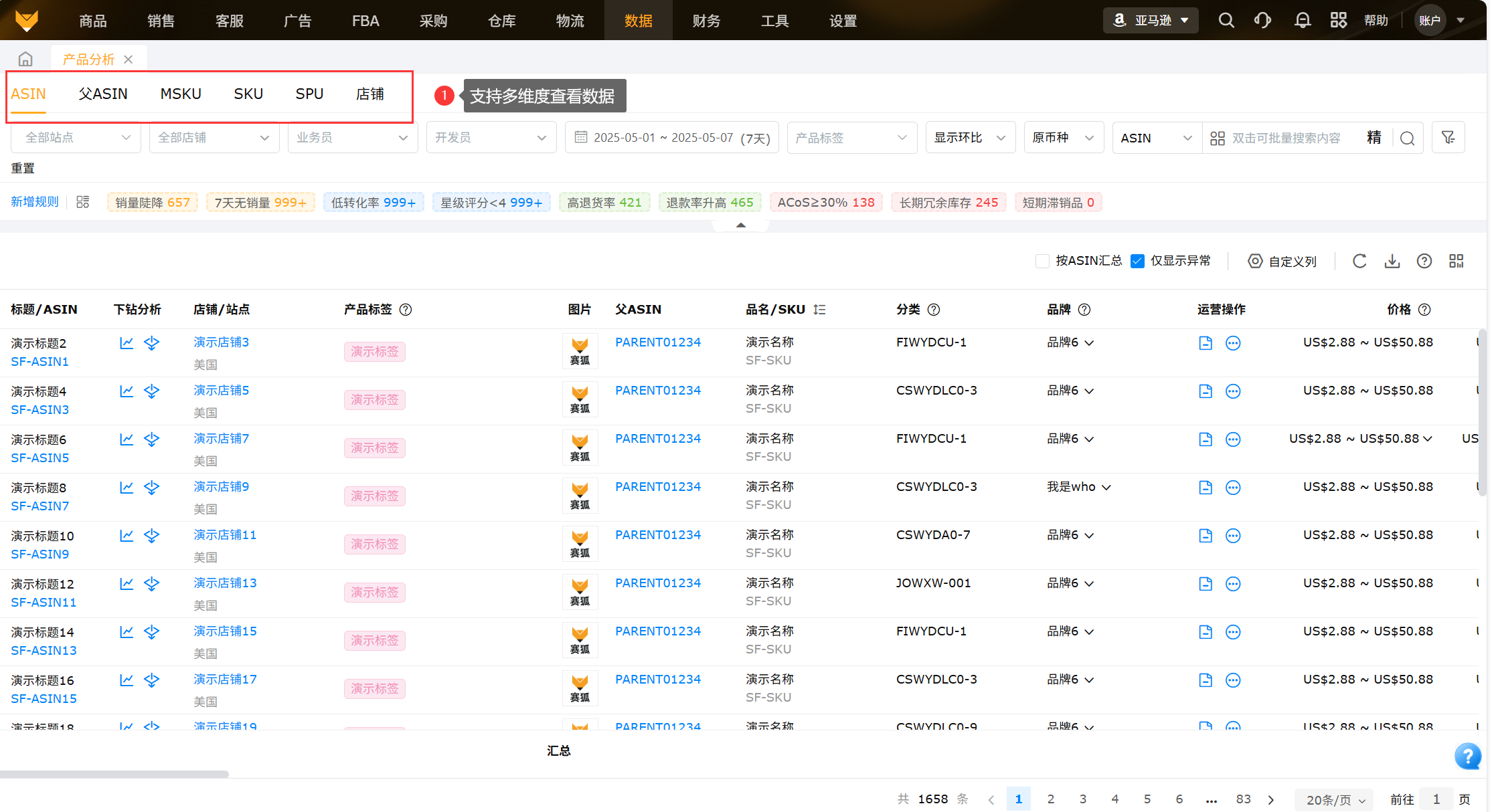 从产品维度将ASIN的销量、流量、转化率、广告等产品数据进行汇总以及显示各指标周期环比以及异常ASIN数据,便于运营查看数据变化,为运营决策分析提供支撑。