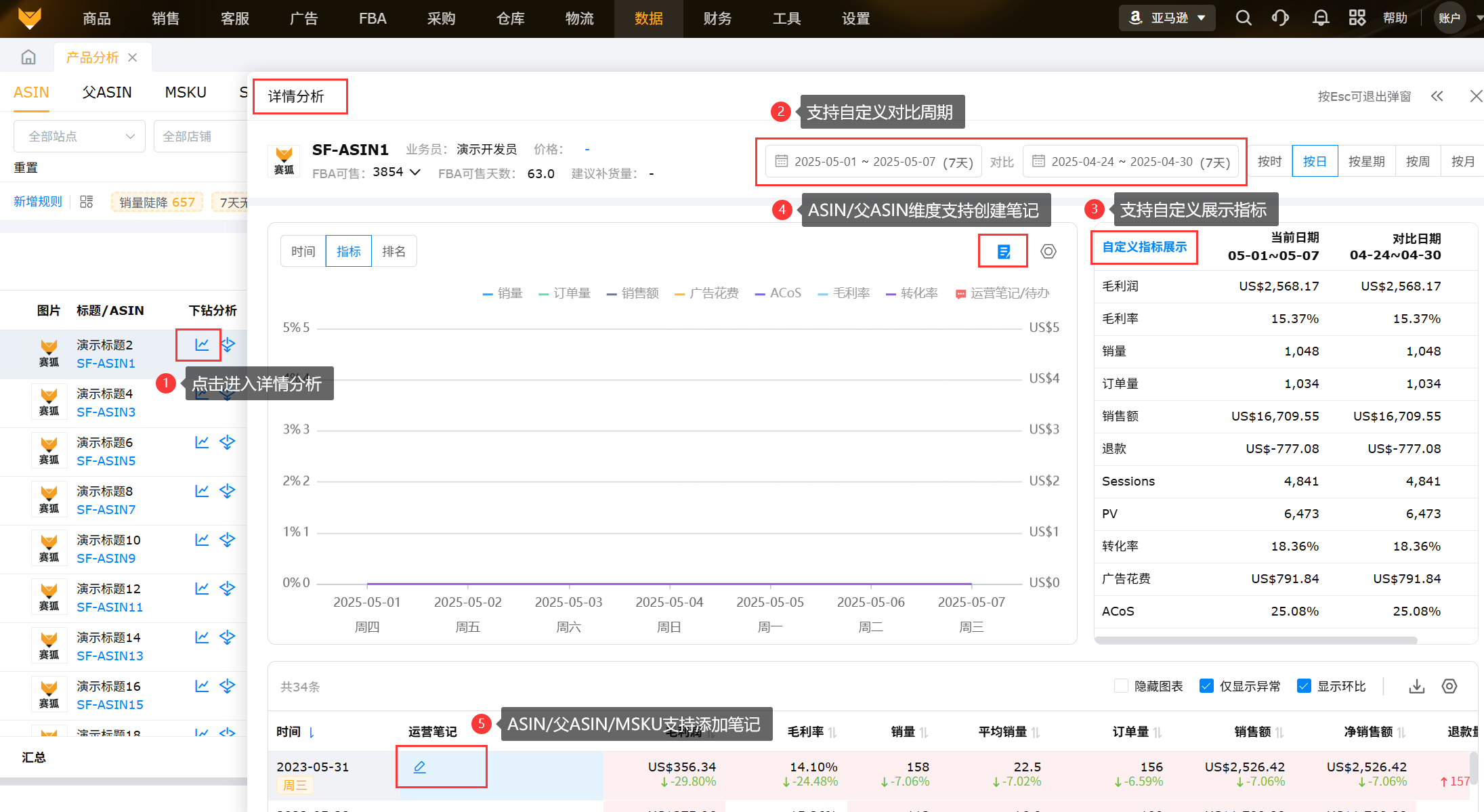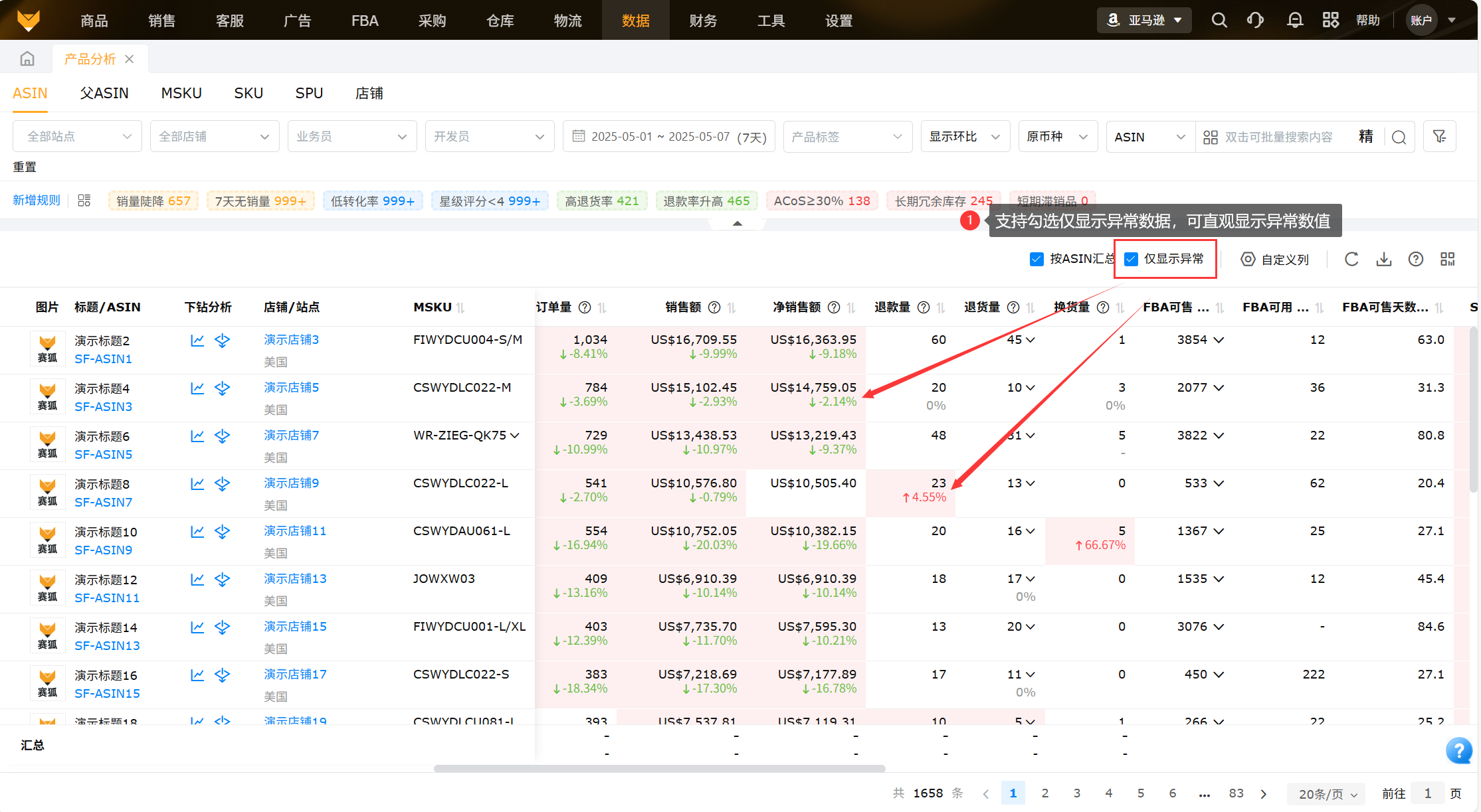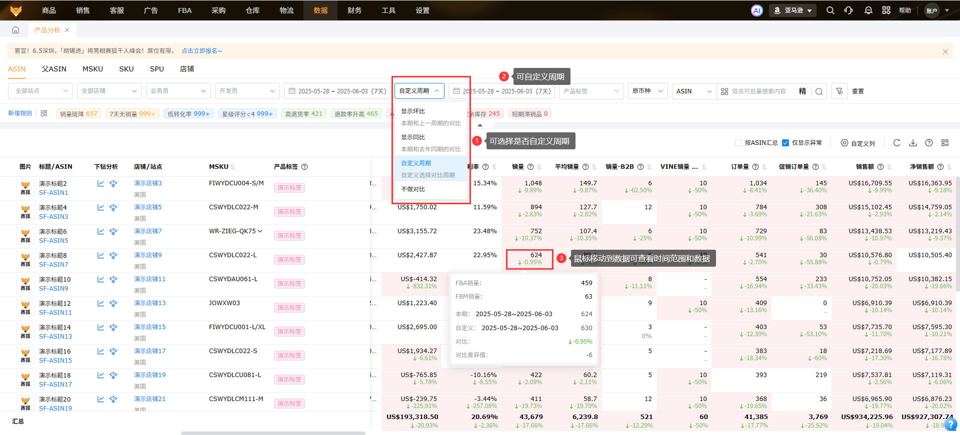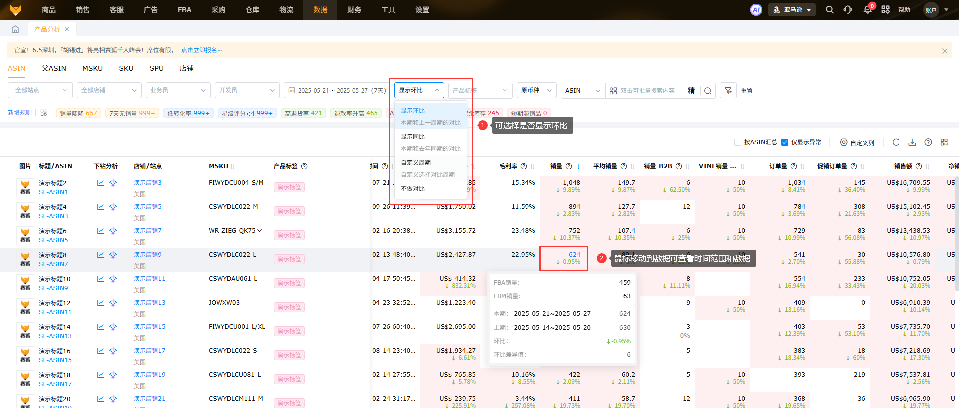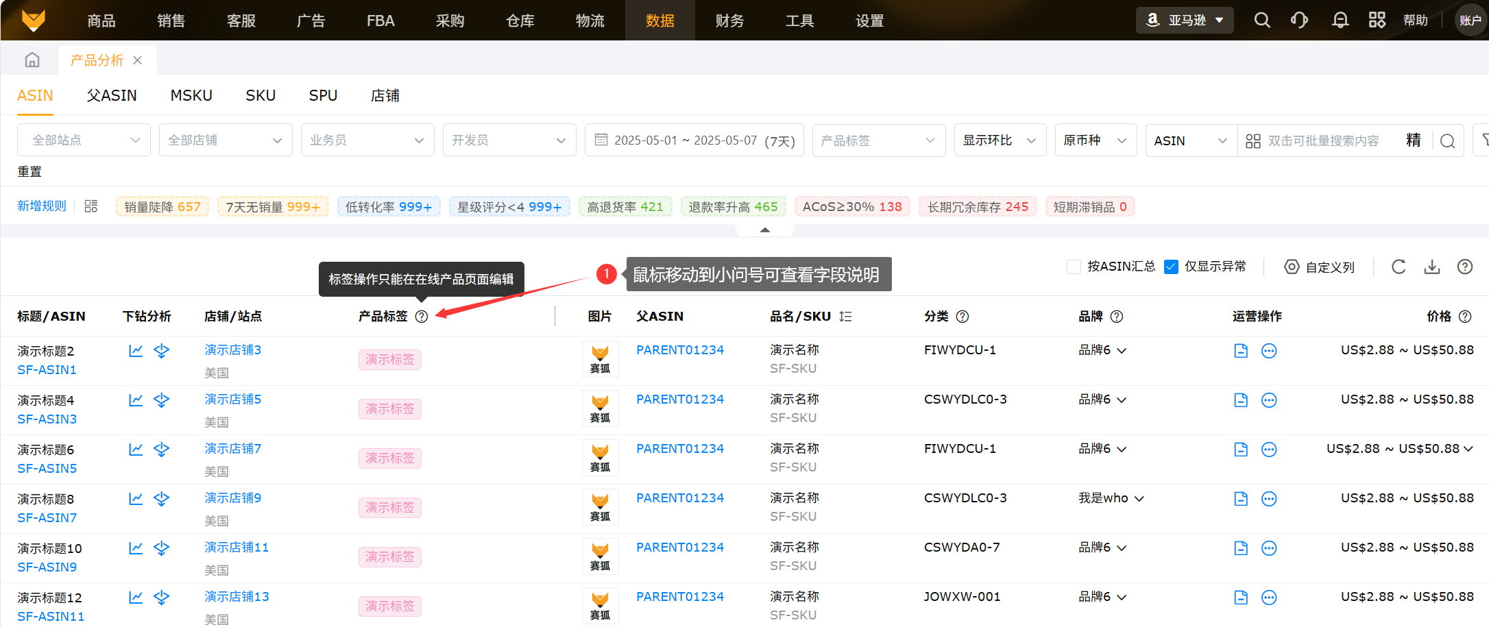 从产品维度将ASIN的销量、流量、转化率、广告等产品数据进行汇总以及显示各指标周期环比以及异常ASIN数据,便于运营查看数据变化,为运营决策分析提供支撑。
