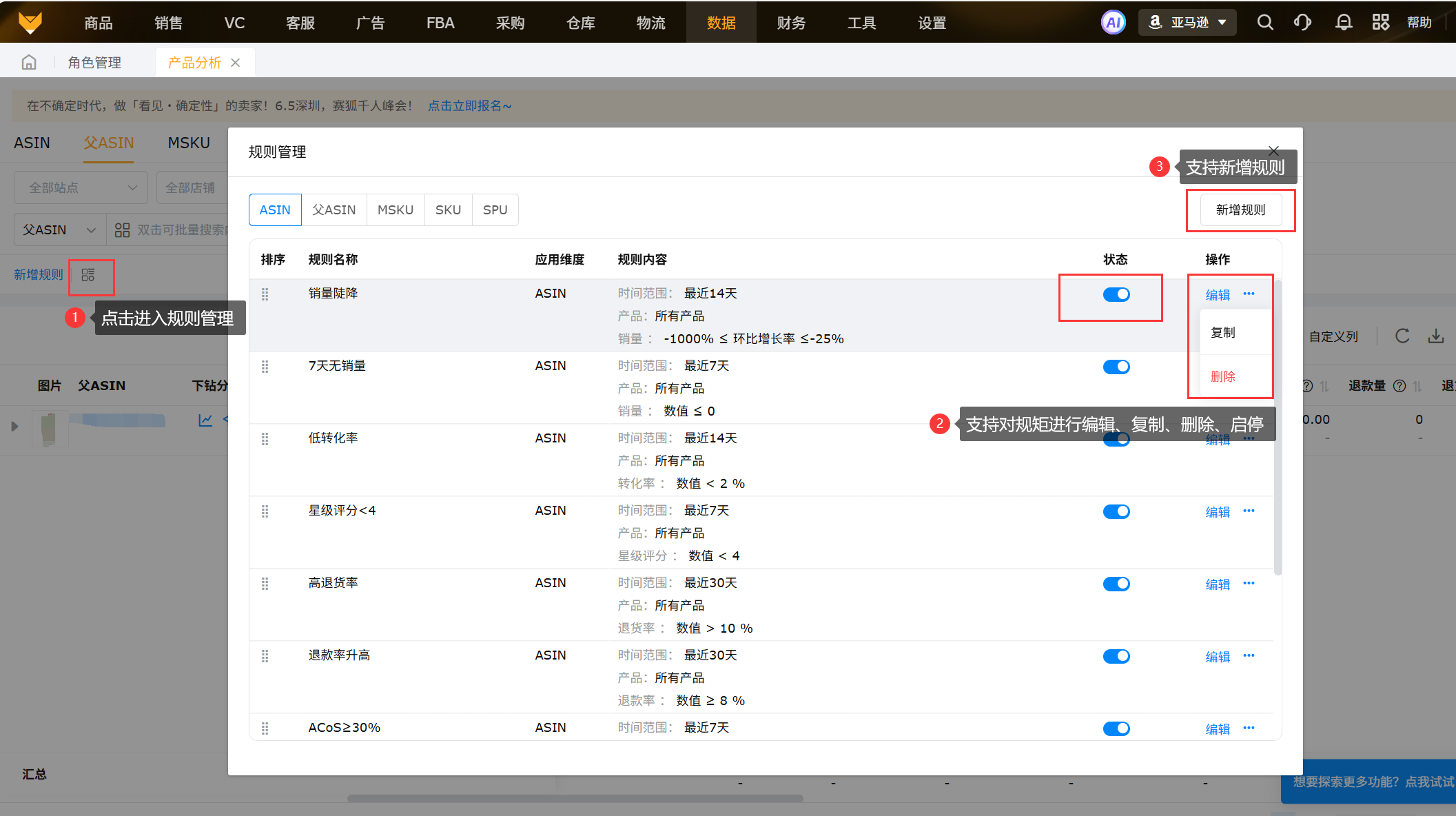 ASIN、父ASIN、MSKU、SKU、SPU支持自定义异常规则,设置规则管理,填写阈值,规则设置好后,系统会统计设置范围内的异常数据,启用的规则每天执行一次,每天北京时间下午4点更新一次。