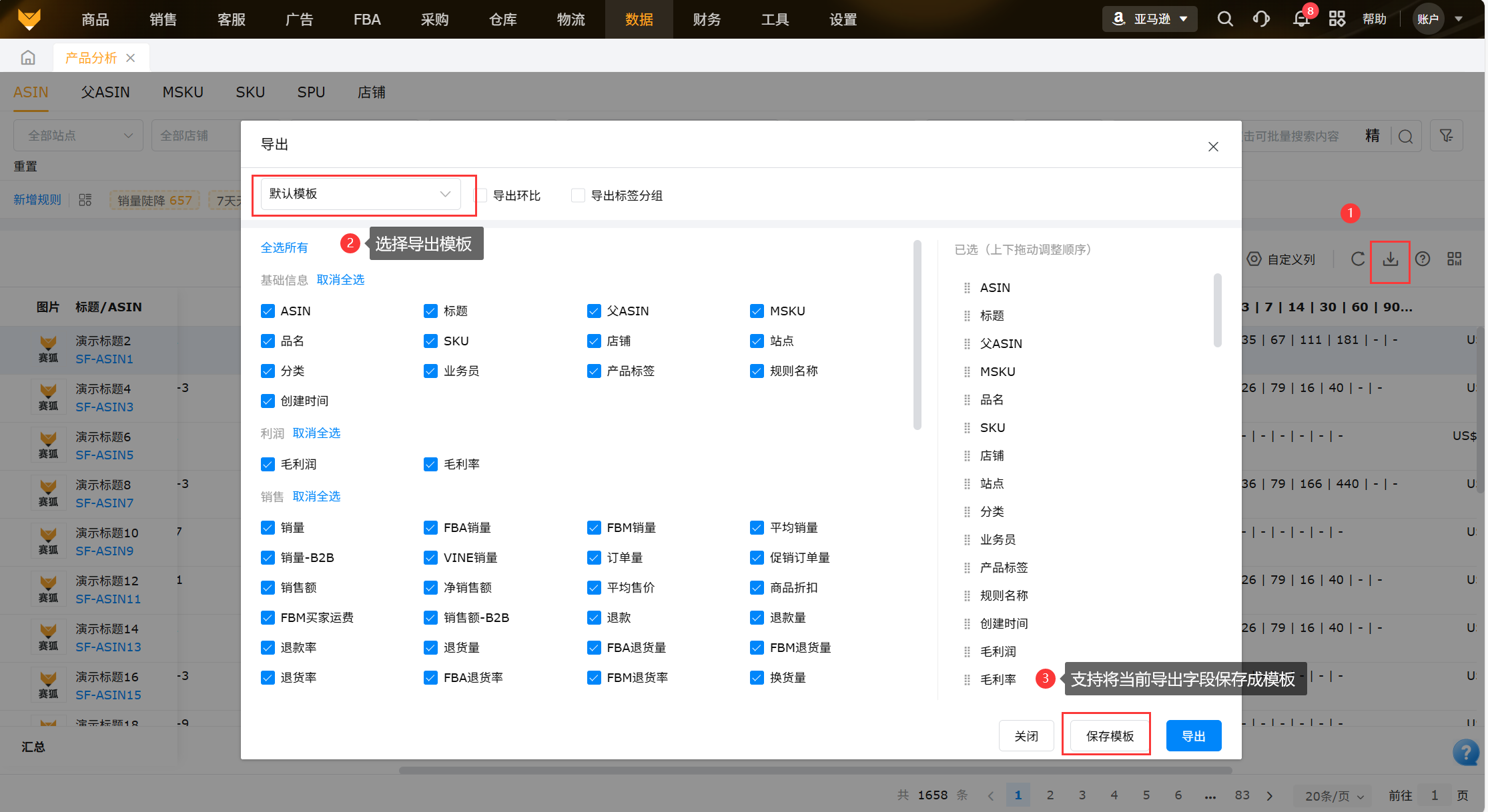 支持自定义字段顺序导出表头数据,支持将导出的字段保存成模板,方便下次导出数据。导出的时候可选择任意时间段的最长62天的数据。