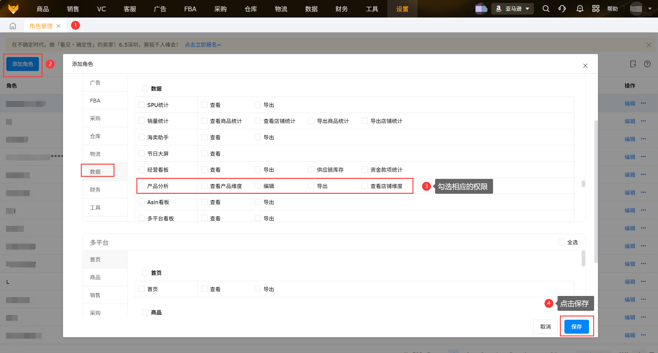 主账号需要给子账号分配查看产品分析的权限,在【设置】-【角色管理】添加角色,填写角色名称,选择数据模块,勾选相应权限,点击保存。