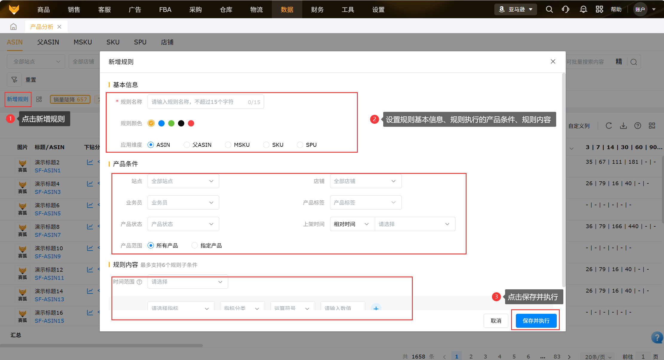 点击“规则管理”,点击“新增规则”,填写规则名称、站点/店铺、填写ASIN、时间范围、选择需要查看的指标,填写阈值,点击保存并执行。