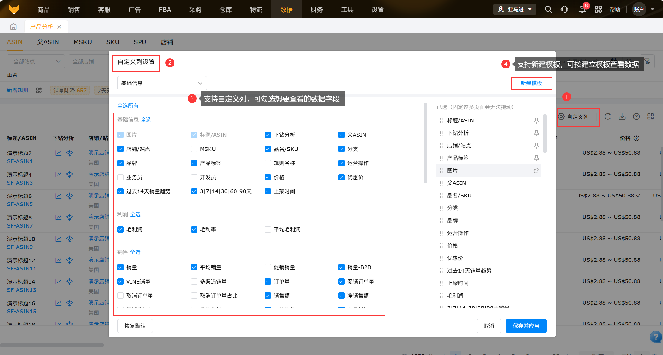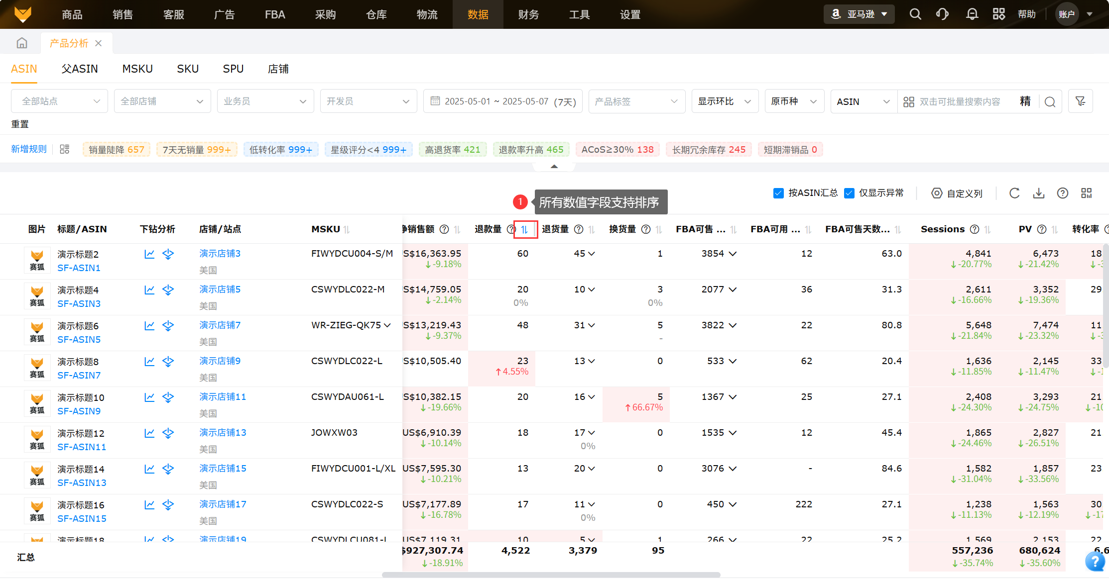 根据站点、店铺、时间、币种、业务员和ASIN/父ASIN/MSKU/SKU/SPU/店铺进行搜索,可以跨店铺汇总,查看产品各项指标的表现情况;