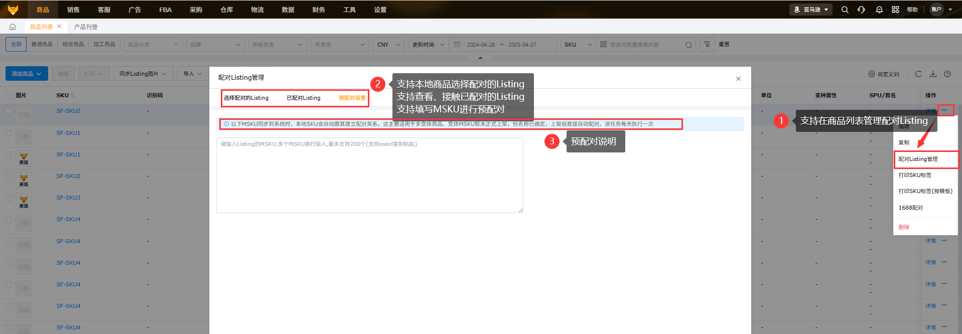 支持选择配对Listing,支持查看、解除已配对的Listing,支持预配对:当MSKU同步到系统时,本地SKU会自动建立配对关系,每天执行一次。
