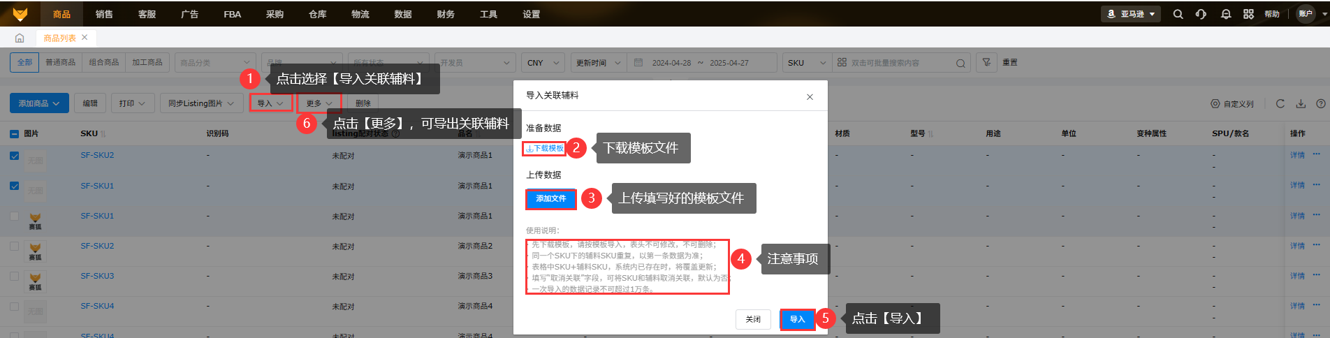 点击【导入关联辅料】,下载模板,填写信息,完成后点击【添加文件】进行导入即可。