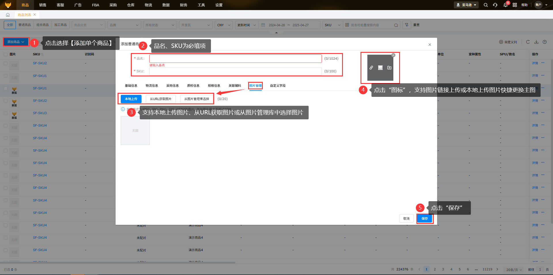 (1)点击【添加单个商品】,品名、SKU为必填项; 注意:SKU不支持填写中文。