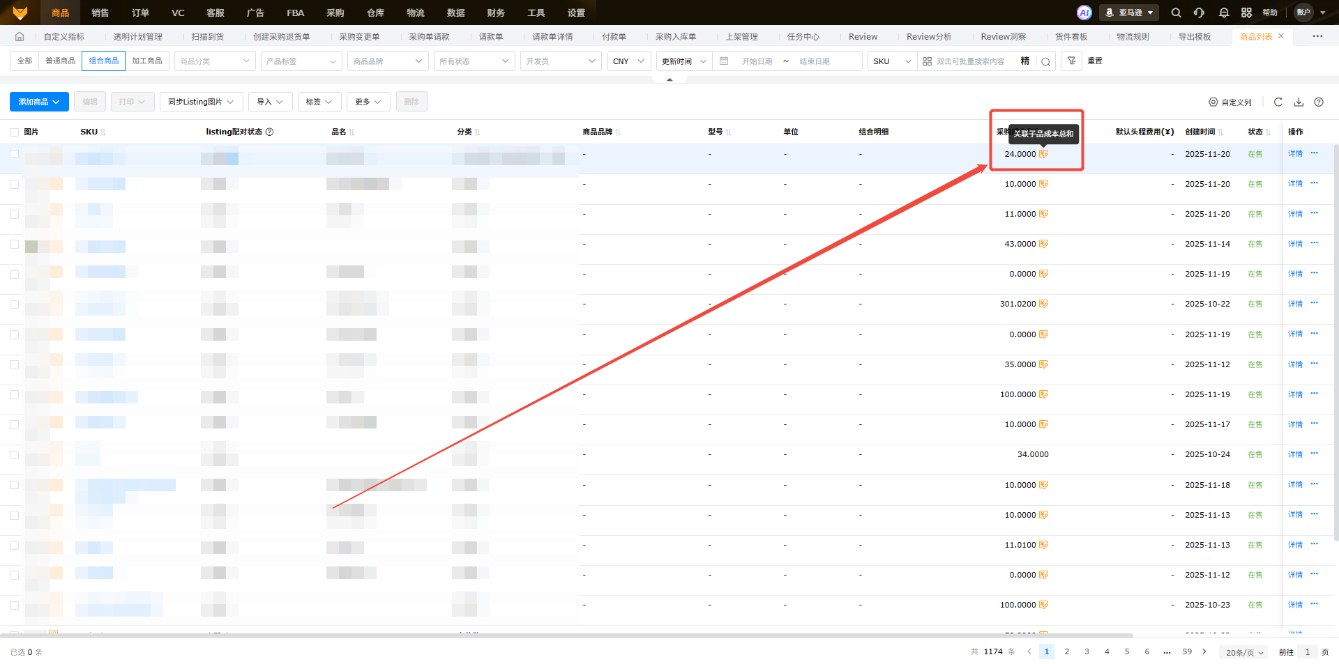 当加工商品和组合商品勾选关联子商品采购成本的时候,商品列表的采购成本会有对应的图标显示。