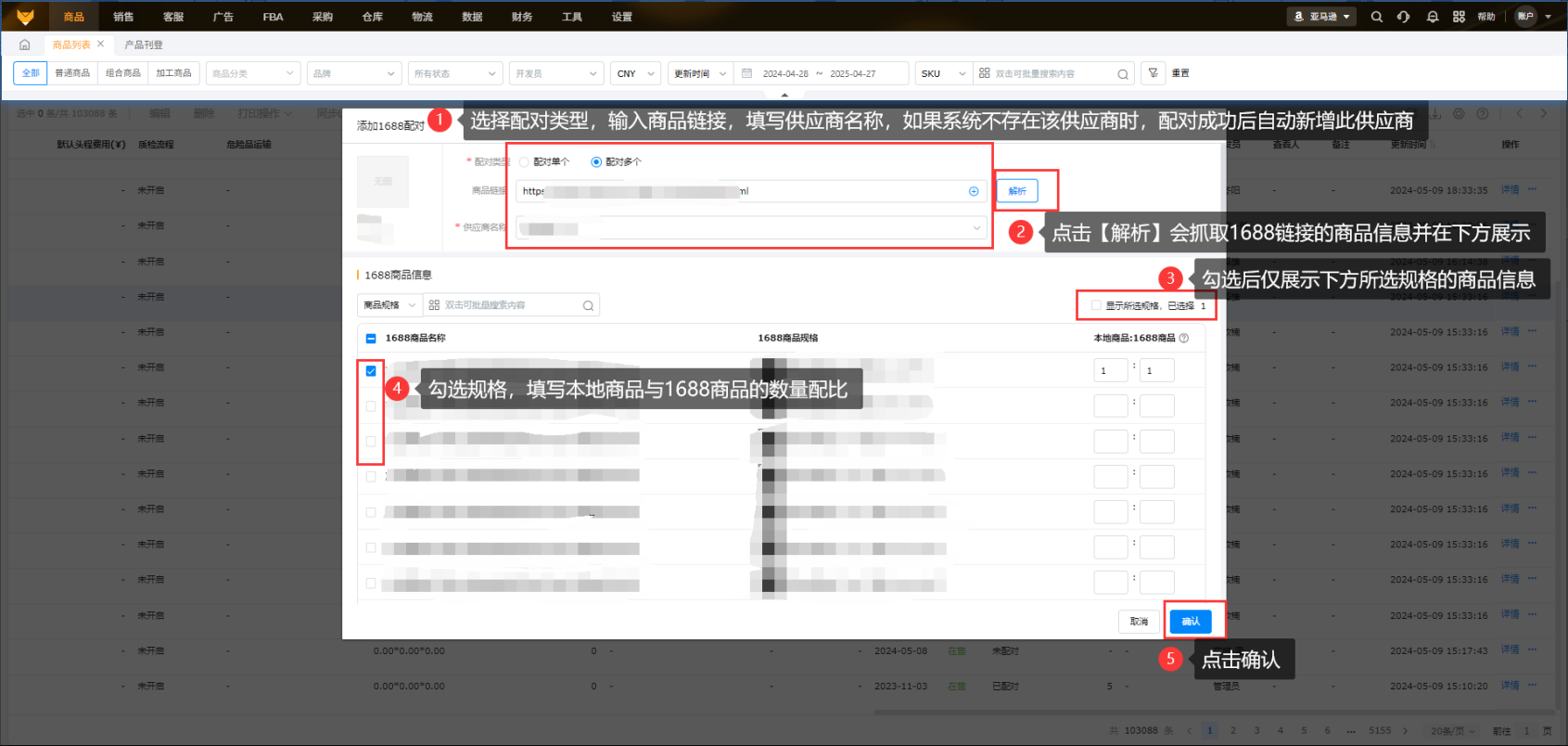 (7)点击【1688配对】,可快捷将1688链接和本地商品关联起来。
