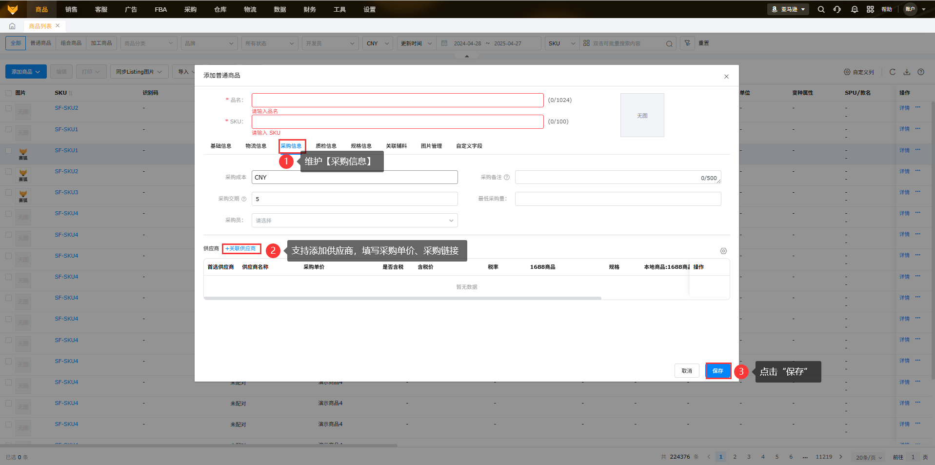 【添加关联供应商】:填写采购单价和采购链接,以便对比供应商价格和快速下单采购;