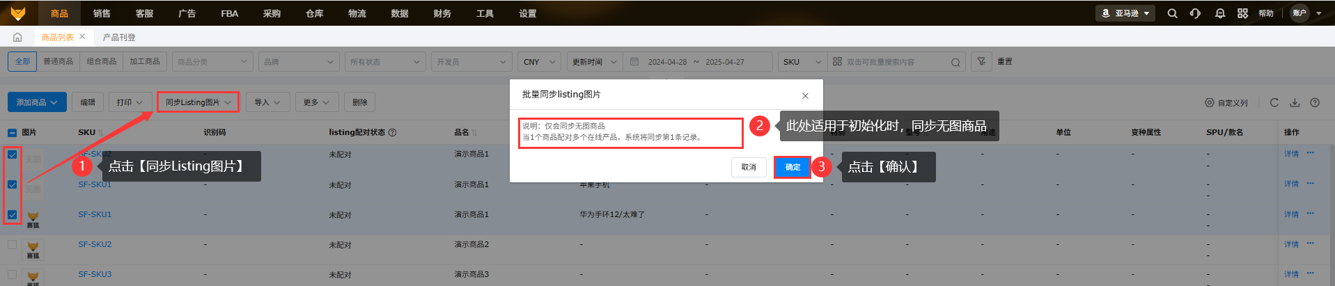 ①点击列表上方【同步listing图片】,支持勾选产品同步Listing图片。