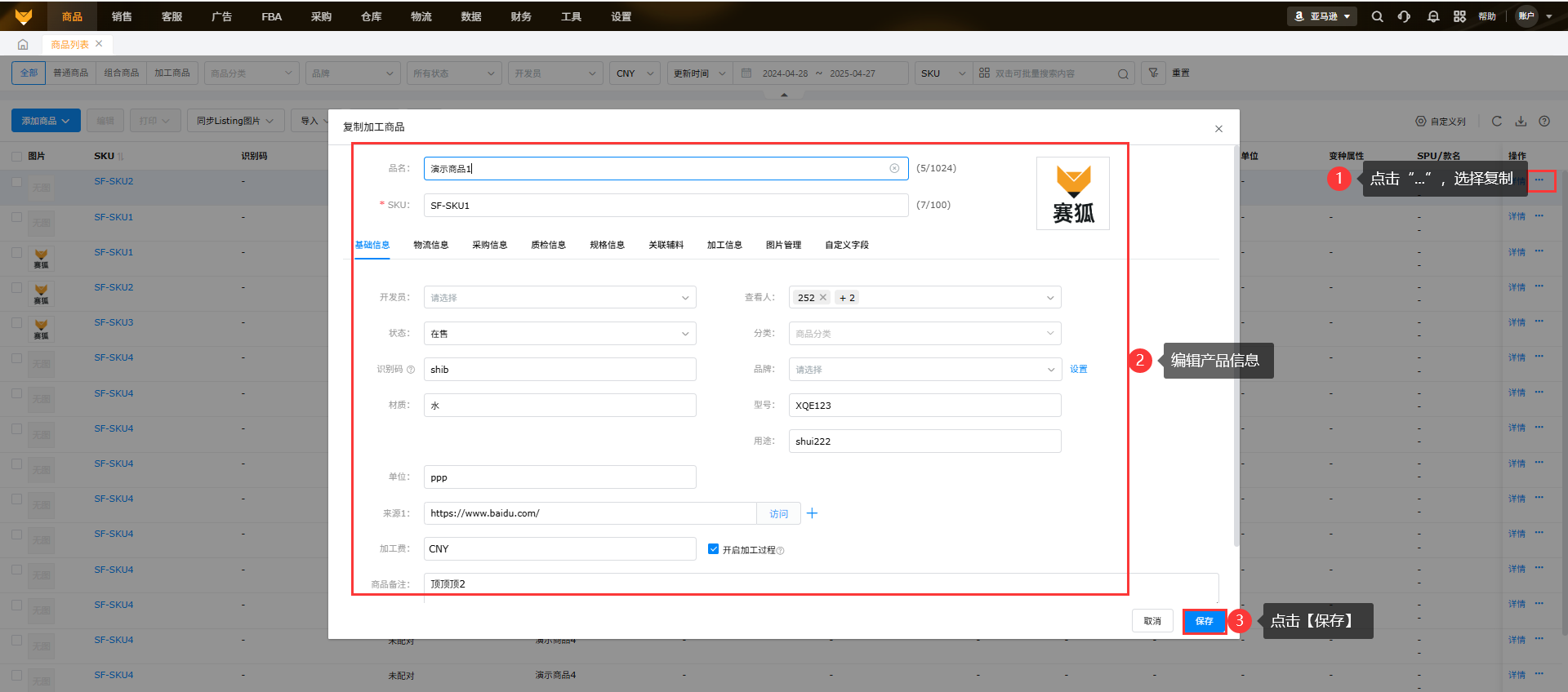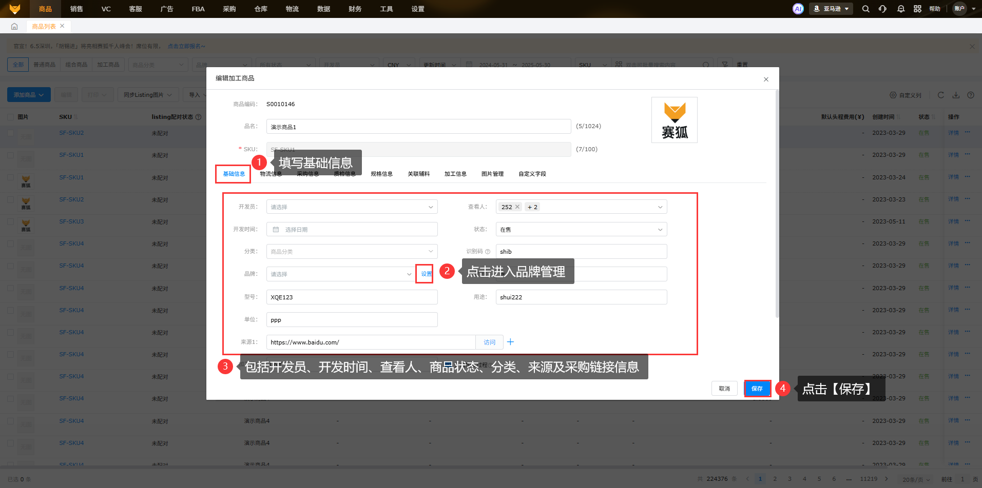 ②编辑界面支持修改款名,修改变种SKU的名称、来源URL、采购成本、重量等信息。