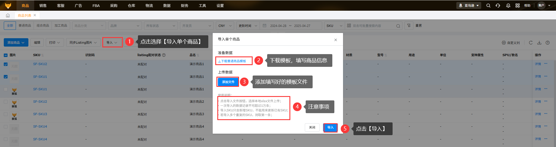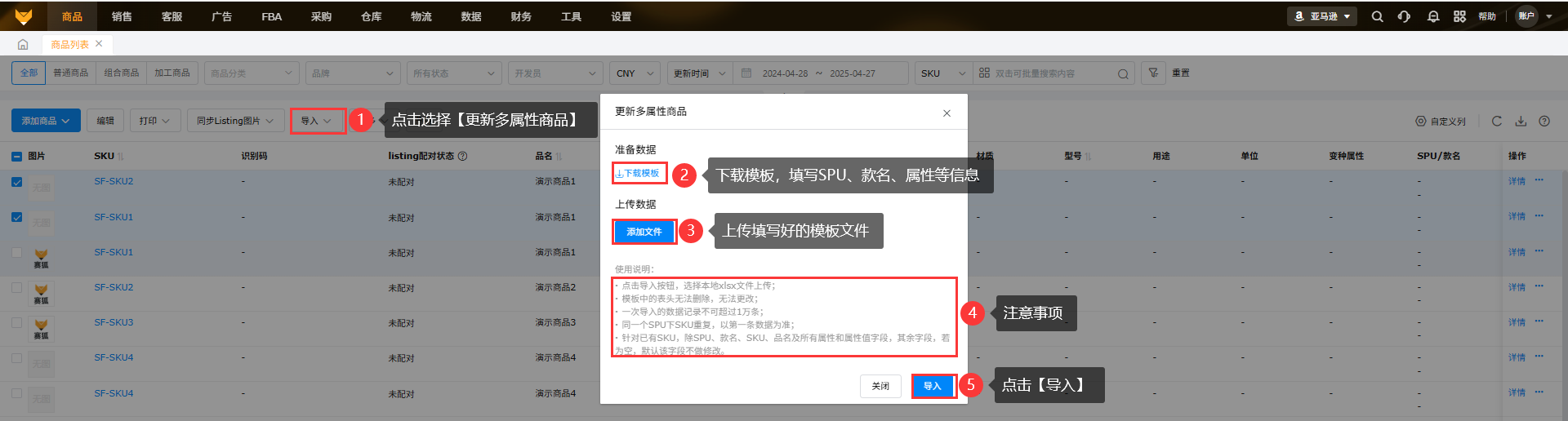 点击【导入多属性商品】,选择添加新SKU或者添加本地SKU,然后下载模板填好数据,点击【添加文件】导入即可。