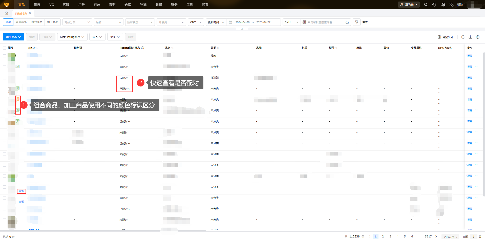 (2)组合商品、加工商品使用不同颜色的标识区分,可以快速查看Listing配对状态。