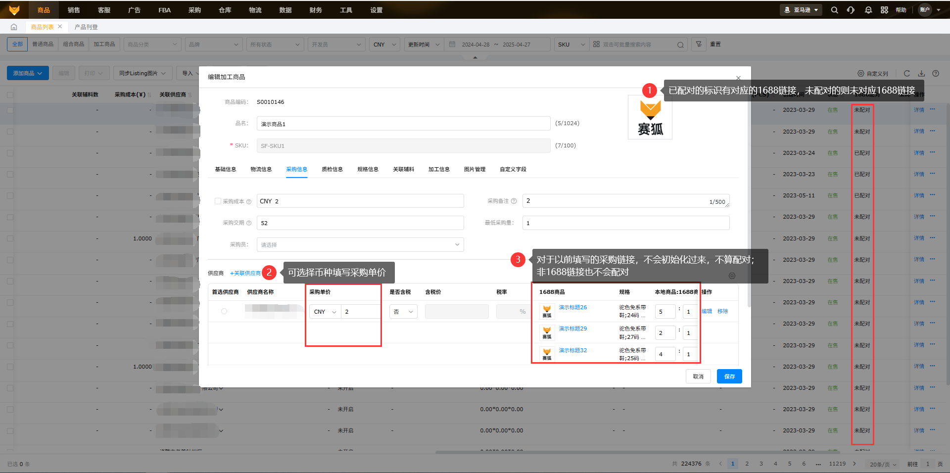 规则:只有相同赛狐供应商+相同1688供应商不同链接或者相同链接支持配对一个SKU;