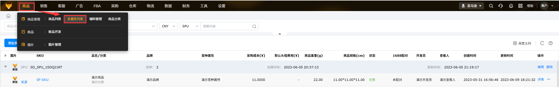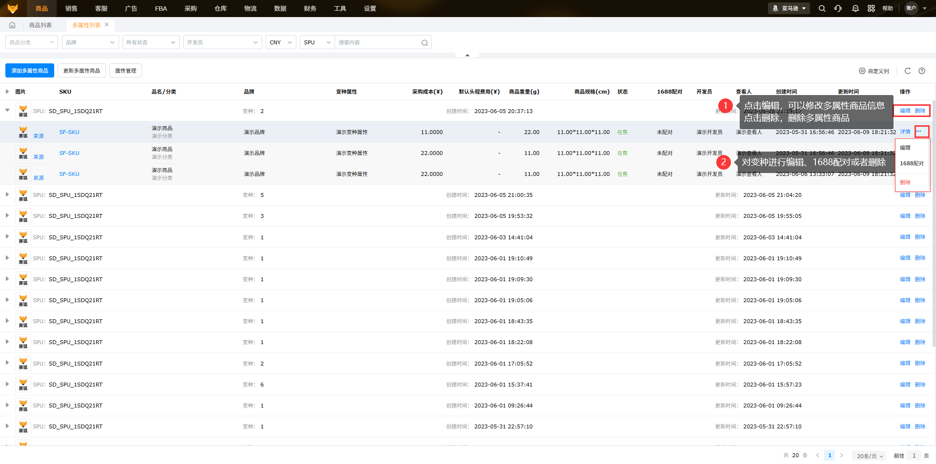 ①创建好的多属性商品可在【多属性列表】页面进行编辑修改、删除。