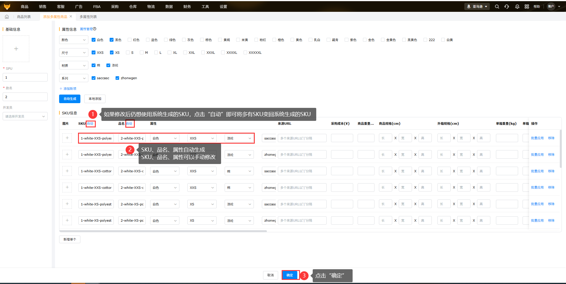 (3)选择属性、点击【自动生成】生成SKU变种,SKU支持自定义修改,如SKU修改后想使用系统生成的SKU,点击“自动”即可全部SKU变回系统自动生成的SKU。
