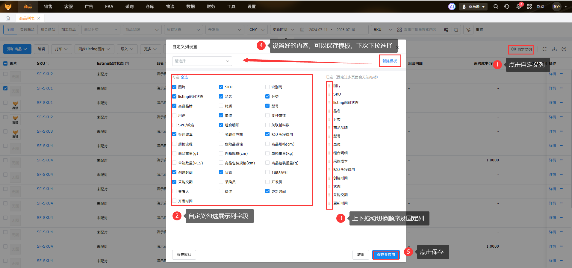 (1)商品列表支持查看SKU、品名、品牌、材质、型号、质检流程、关联供应商、危险品运输、尺寸、重量、箱规、单箱重量、采购时长、采购员、开发员、备注等商品信息,支持自定义调整顺序列。