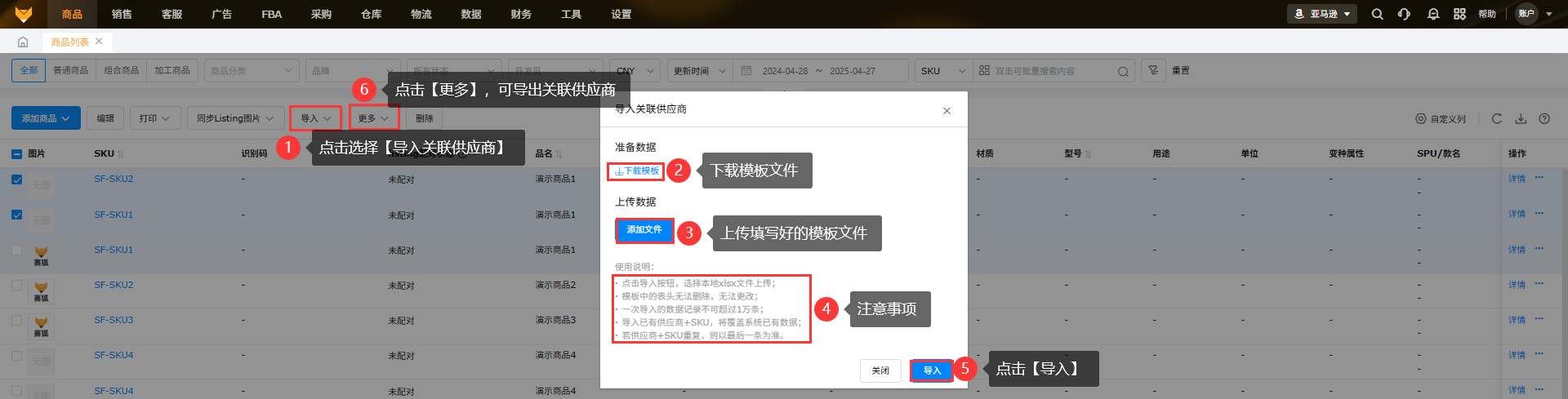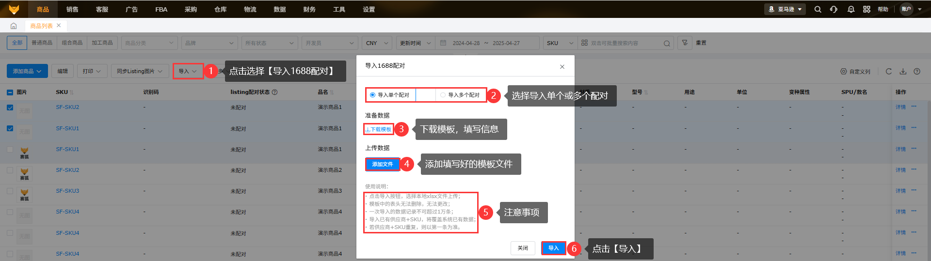 点击【导入1688配对】,下载模板,填写SKU、供应商名称、1688链接、1688商品属性,完成后点击【添加文件】进行导入即可。
