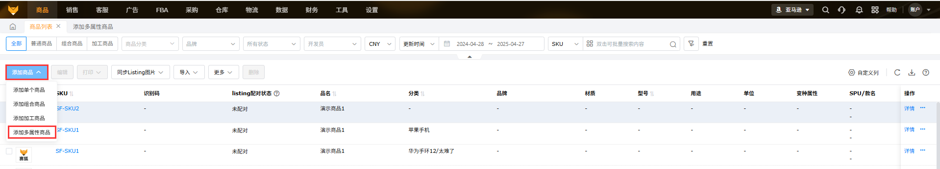 (1)在添加商品中,点击【添加商品】,选择【添加多属性商品】。