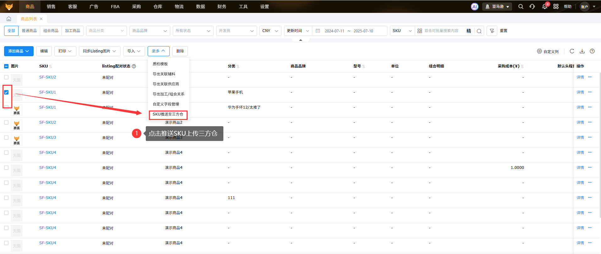 目前支持将商品列表的SKU信息推送至极风海外仓系统,点击“更多”,选择“SKU推送至三方仓”,跳转进入到【三方仓库存】-【SKU推送至三方仓】页面,选择需要推送的SKU;