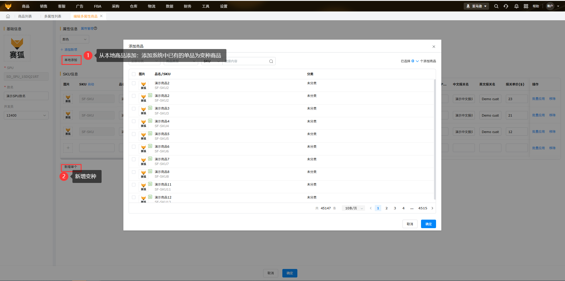 ③支持添加新变种,点击“新增单个”或者【本地添加】即:添加【商品列表】中的单个商品为变种商品。