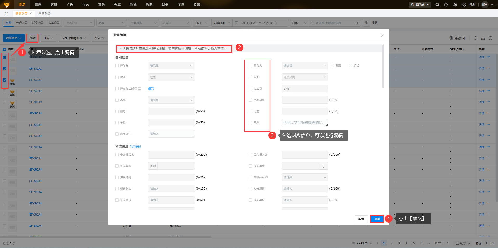 首先勾选多个需要编辑的商品,点击【编辑】,勾选对应信息再进行内容编辑,点击【确认】。