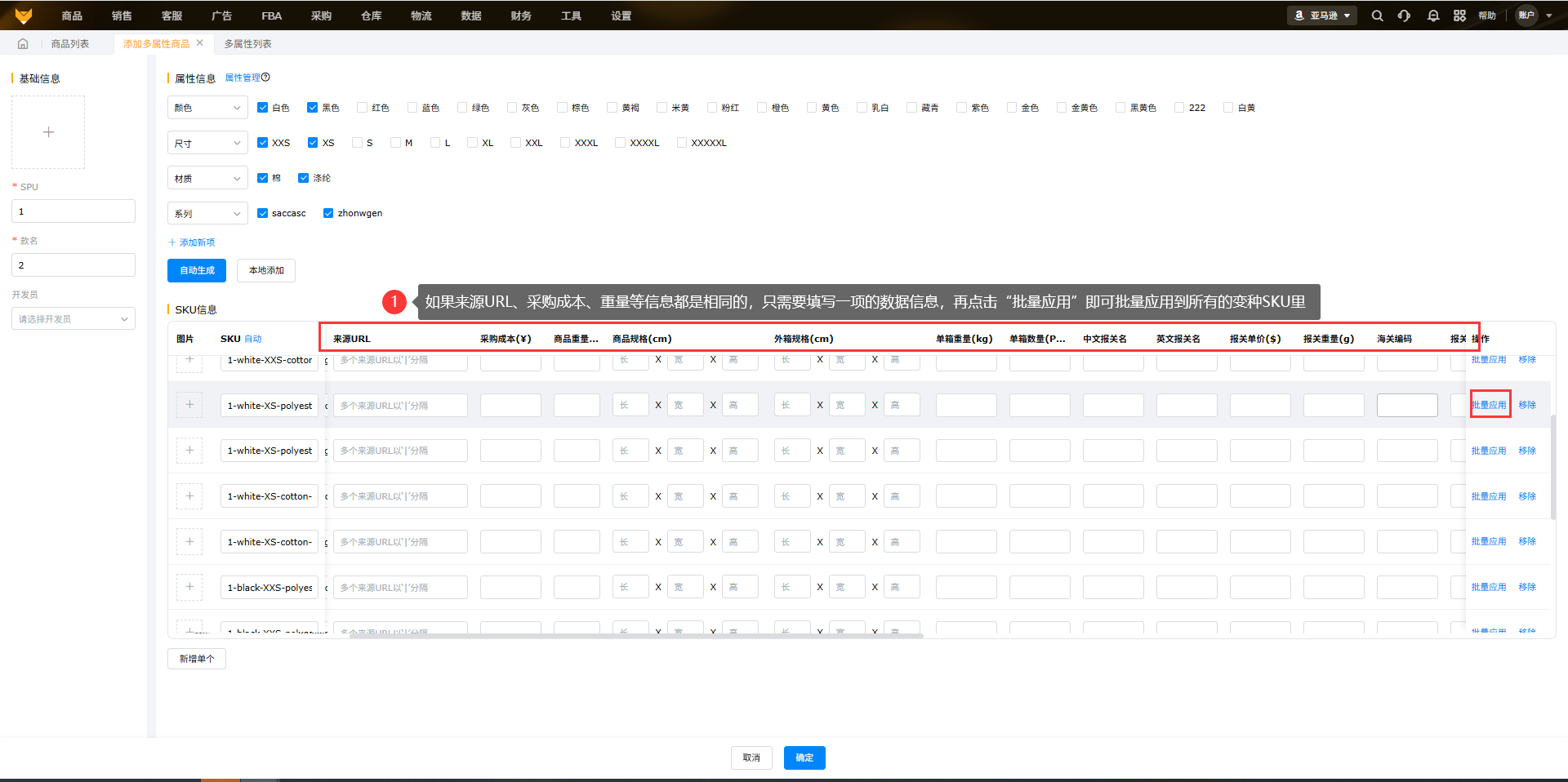 (4)如果名称、来源URL、采购成本、重量等信息都是相同的,只需在其中一列填入数据信息,再点击“批量应用”即可批量添加到所有的变种SKU里。