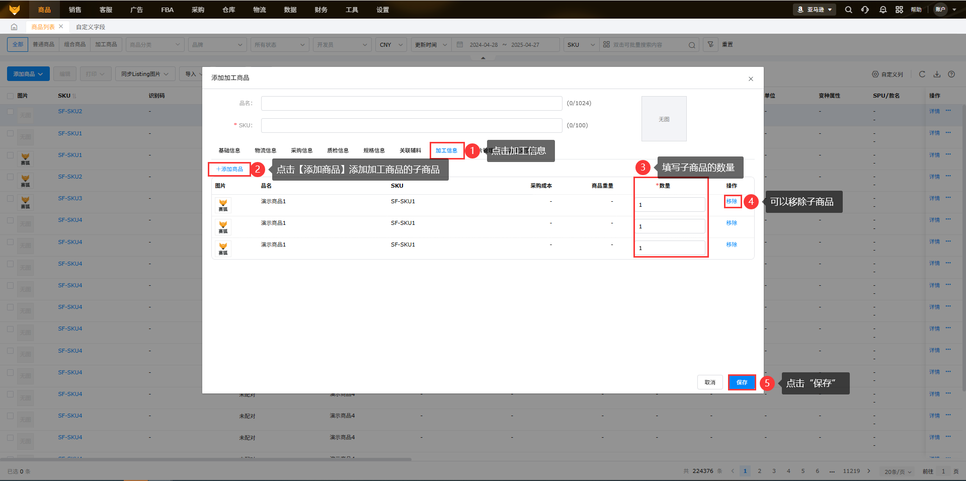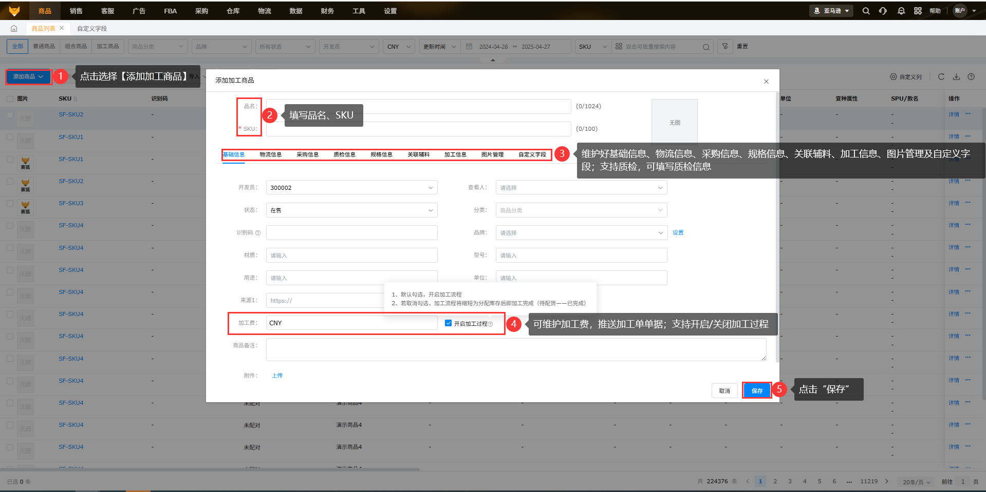 (1)添加加工商品也是在添加好单个商品的基础上进行的,填写品名、SKU,维护基础信息,物流信息和采购信息。加工商品支持二级加工,即加工商品子商品支持添加一级加工商品。(一级加工商品指子商品都是普通商品)