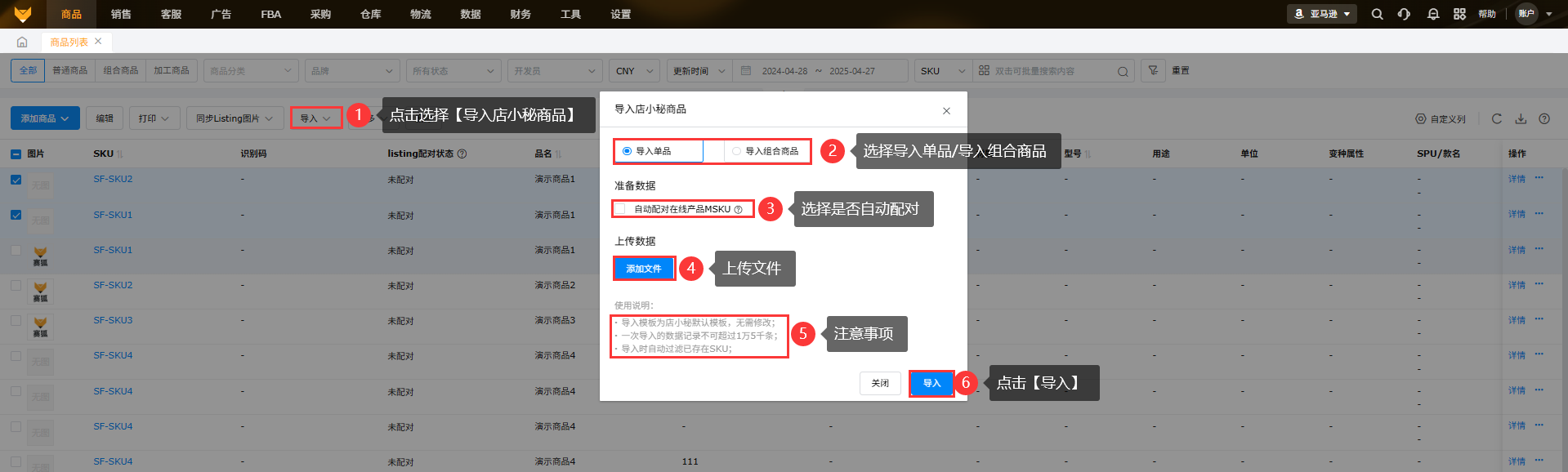 4.2 进入赛狐【商品】模块,点击【导入店小秘商品】,选择单品/组合商品,点击【选择导入文件】进行【导入】即可。可根据情况勾选“自动配对在线产品MSKU”(如果导入的店小秘平台SKU和在线产品MSKU一样,则商品SKU与在线产品MSKU会自动配对)。