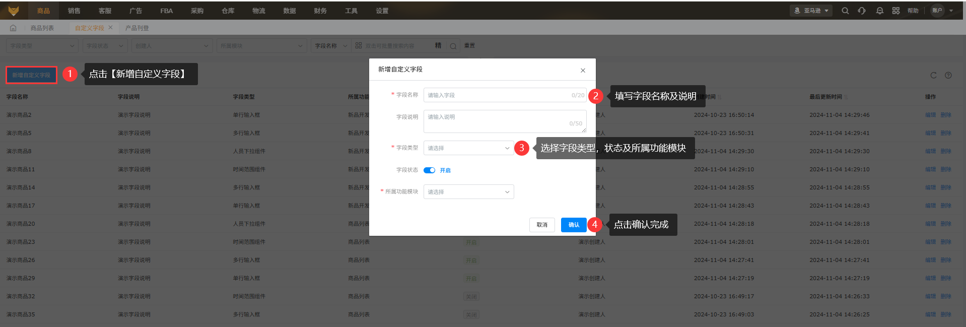 填写对应字段信息,选择字段类型(单行输入框、多行输入框、时间范围组件以及人员下拉组件);开启字段状态决定对应页面是否展示该字段,所属功能模块决定字段展示页面,目前支持添加到商品列表或新品开发页面。