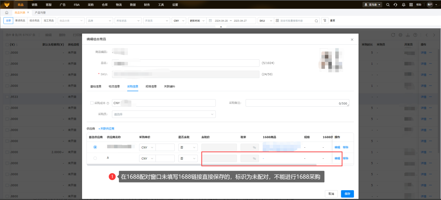 入口2:【添加商品】>【采购信息】>【添加关联供应商】,编辑1688配对;