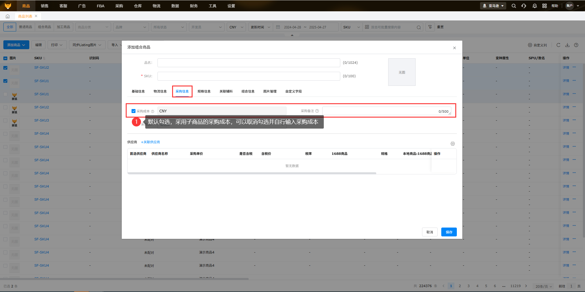 取消复选框勾选时,加工/组合商品的采购成本根据需要手动编辑生成,当子商品采购成本修改时,加工/组合商品的采购成本不会对应的改变。