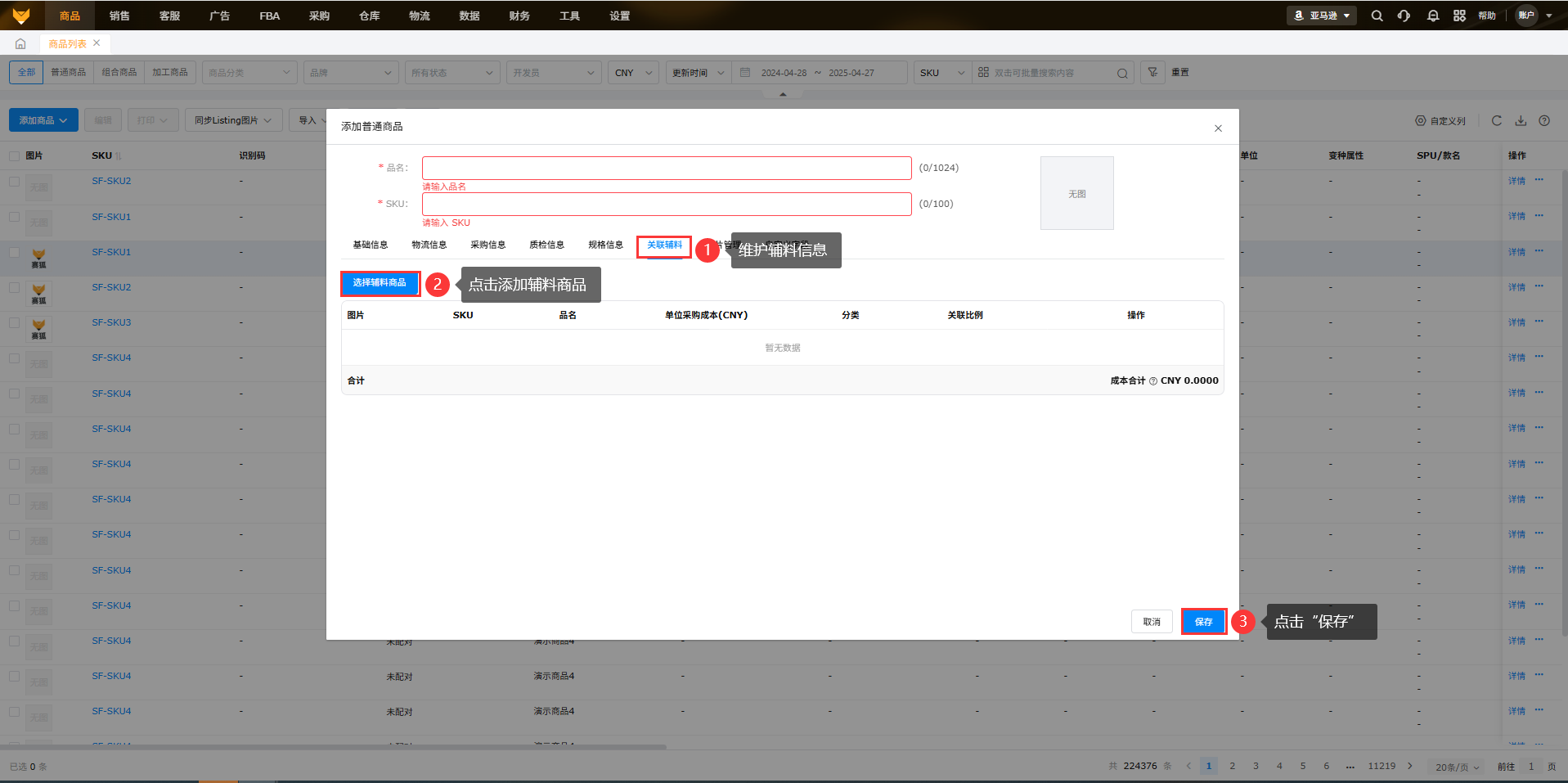 (7)支持添加关联辅料,选择辅料商品进行添加。