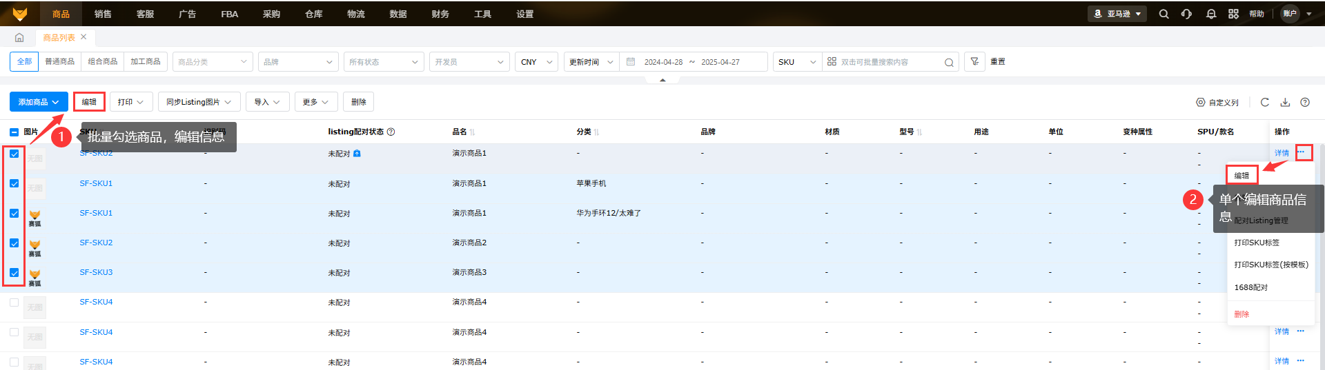 2.批量编辑;勾选商品SKU,批量修改内容;