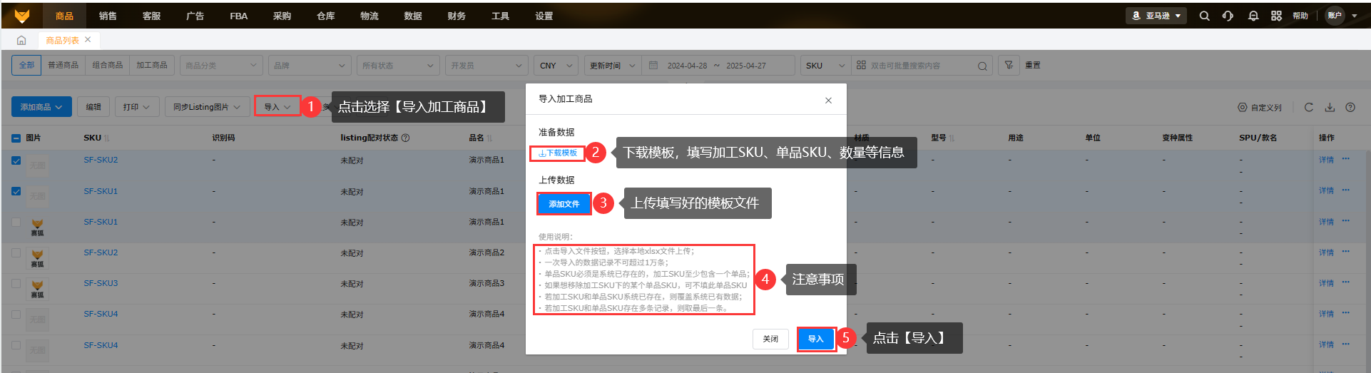 点击【导入加工商品】,先【下载模板】,填写加工SKU、单品SKU、数量信息,完成后点击【选择导入文件】,进行【导入】即可。(注:需先添加单品SKU,才能添加加工SKU)