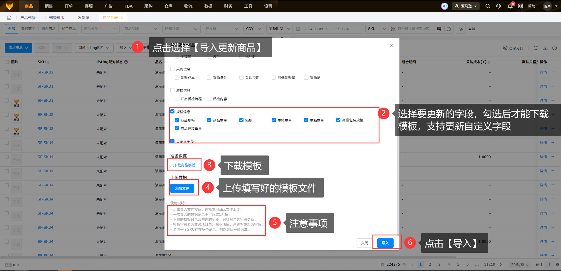 1.选择“导入更新商品”,选择需要更新字段,下载表格修改内容后导入;