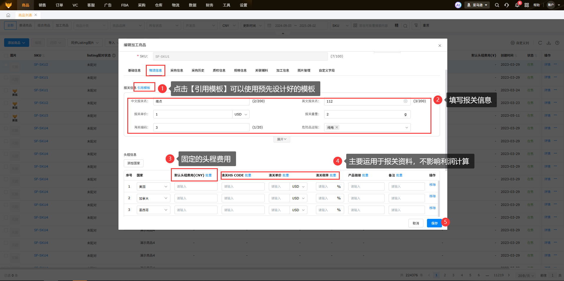 【报关信息】用于物流发票和自发货订单报关使用;点击【引用模板】预设模板,快捷引用;