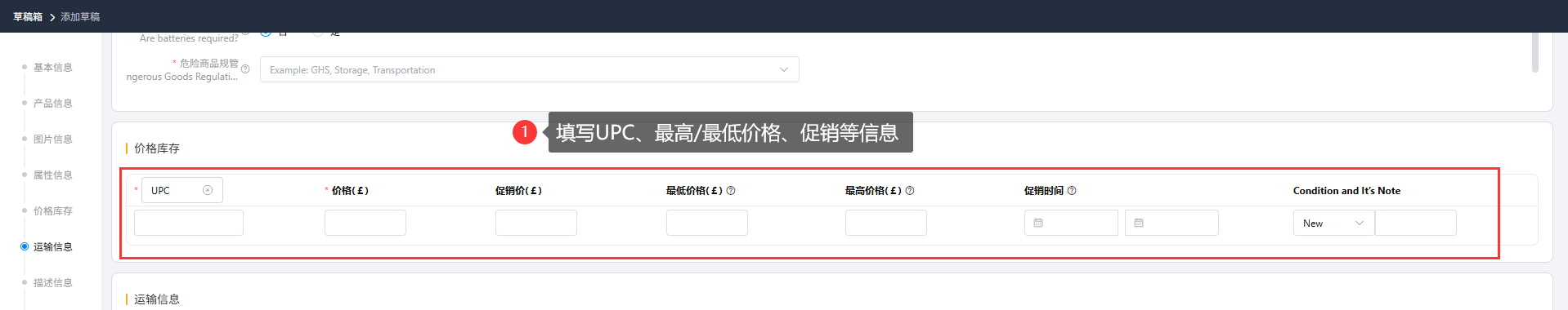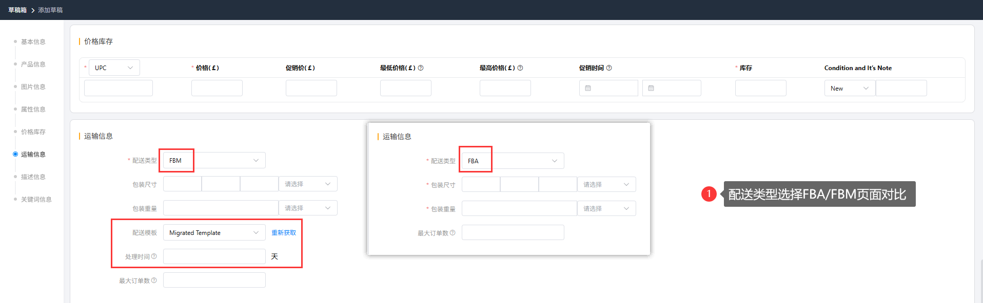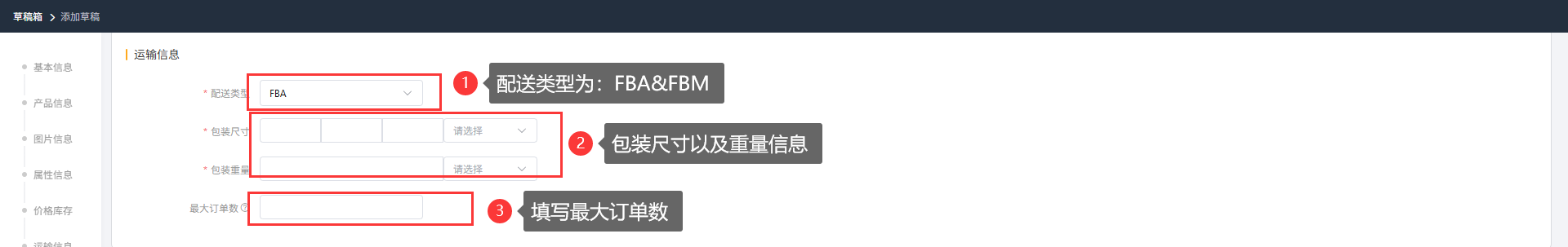 (1)当配送类型选择FBA时,需要填写产品的包装尺寸、包装重量