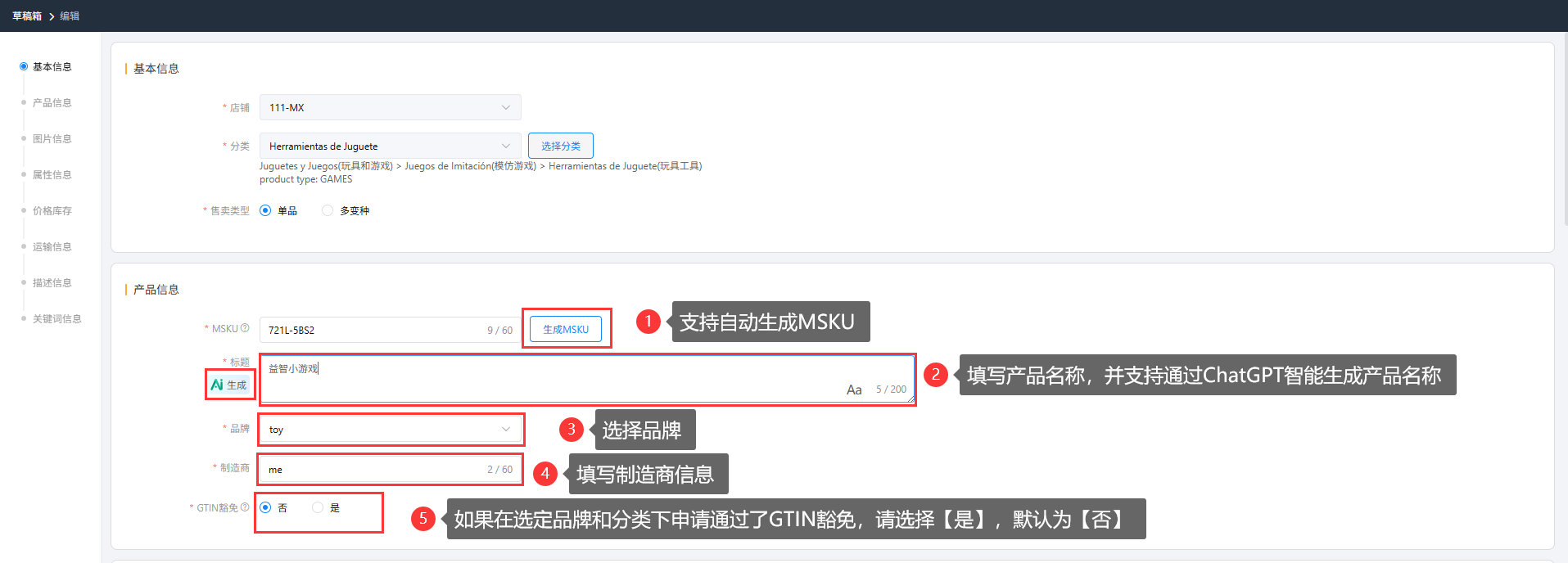 (1)MSKU:单品的ParentSKU=MSKU;父级SKU,可用来标识和区别不同的产品,也可以作为生成其他变种SKU的前缀;例如父级SKU为T331 有黑色,白色两个变种。 使用一键生成功能,自动生成变种SKU为 T331-black,T331-white。(2)产品名称:Listing的标题(支持Listing文案生成联动刊登,生成产品名称)