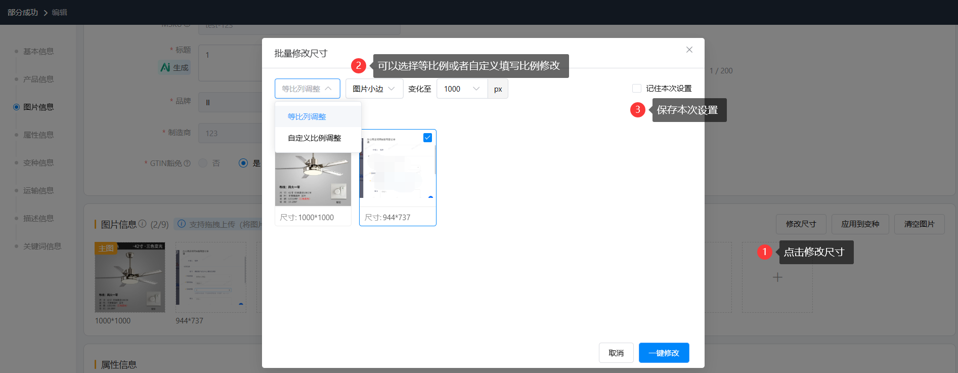 (1)图片可从本地电脑、图片管理上传,也可通过网络图片上传图片链接;支持一次性上传多张图片。(2)应用到变种:比如一件黑色T恤,有不同尺码的变体,可以点击【应用到变种】批量把图片应用到不同尺码的黑色T恤上面。
