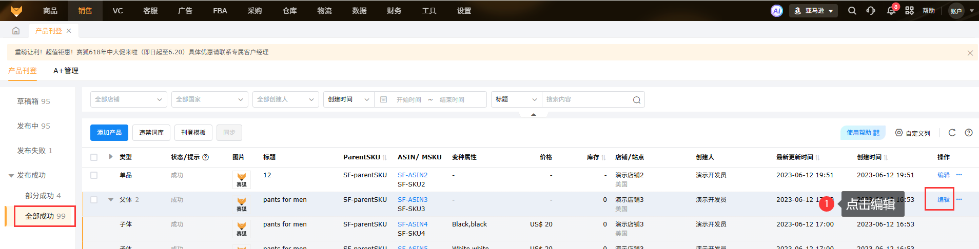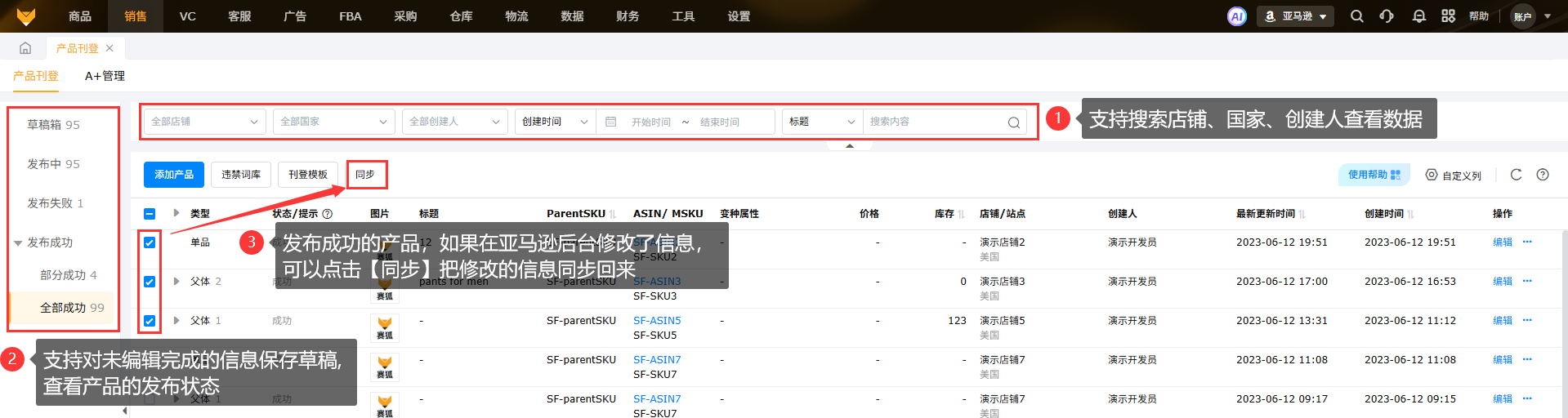 ② 发布成功后如果在亚马逊后台修改了产品信息,可点击【同步】把在亚马逊后台编辑的信息同步到赛狐
