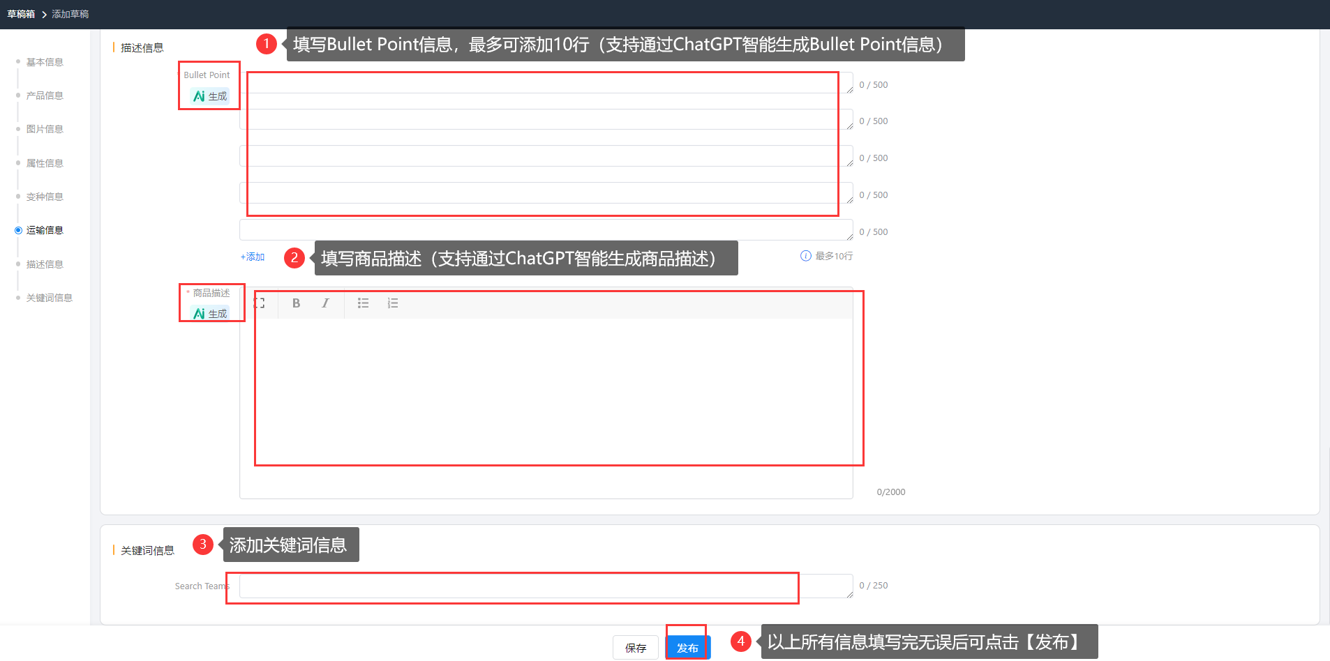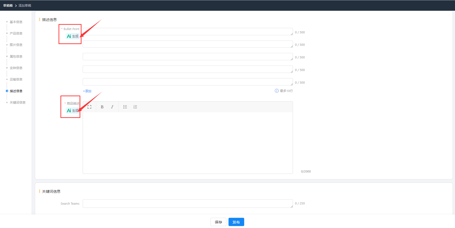 Bullet point:五点描述,可以增加亚马逊产品的销量 ,仅支持文字,展示在产品详情页面注:支持Listing文案生成联动刊登,生成产品描述和Bullet point