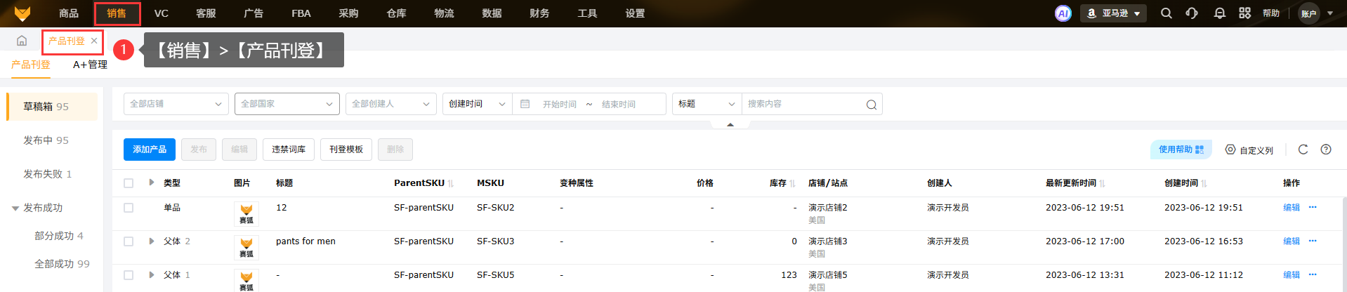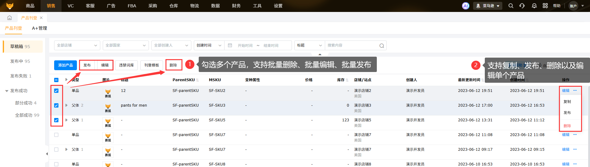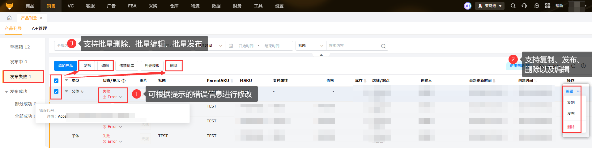 没有⼀个变体/单品发布成功,可根据提示的错误信息进行修改;支持复制、发布、删除以及编辑单个产品,支持批量删除、批量编辑以及批量发布