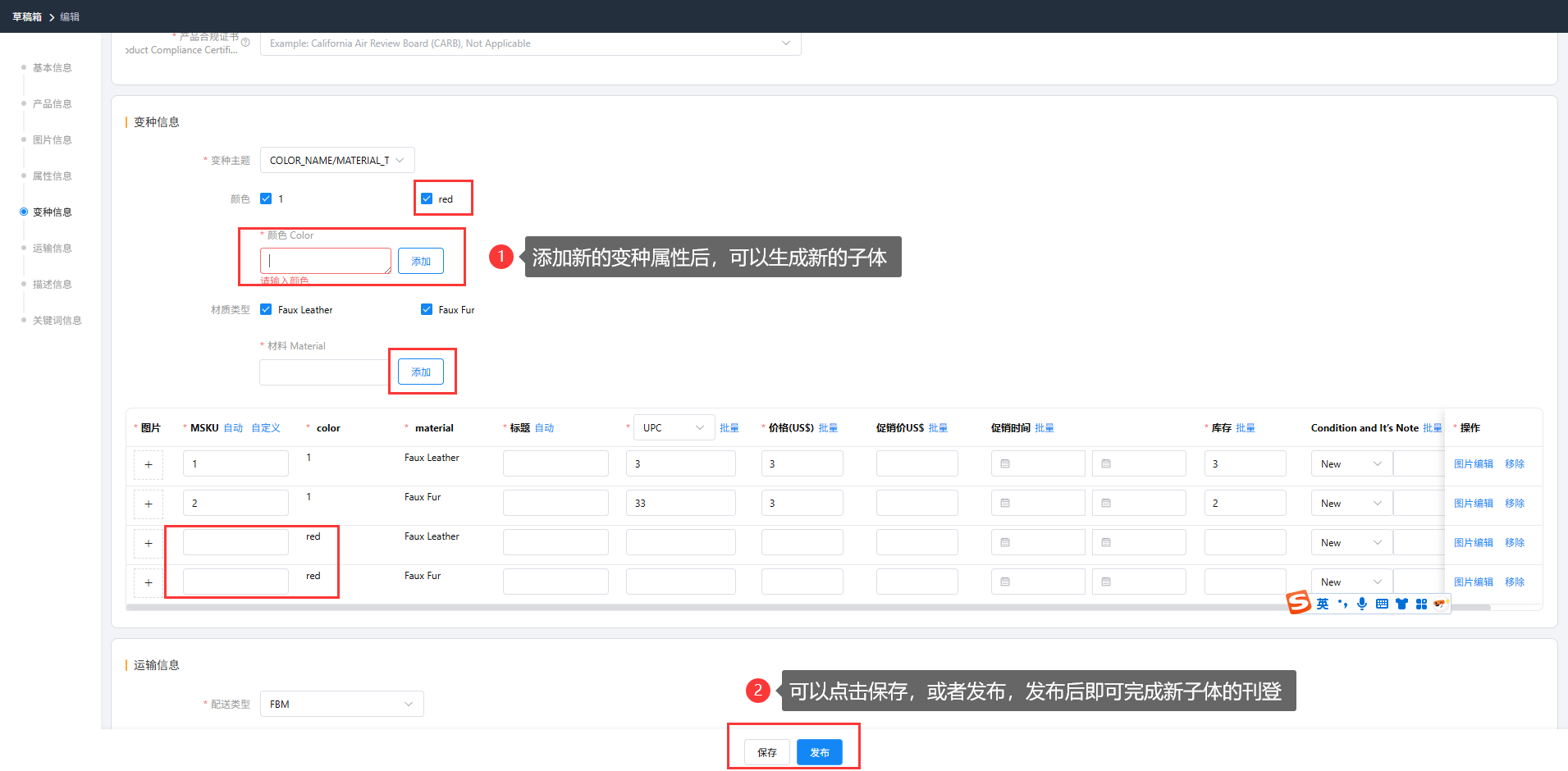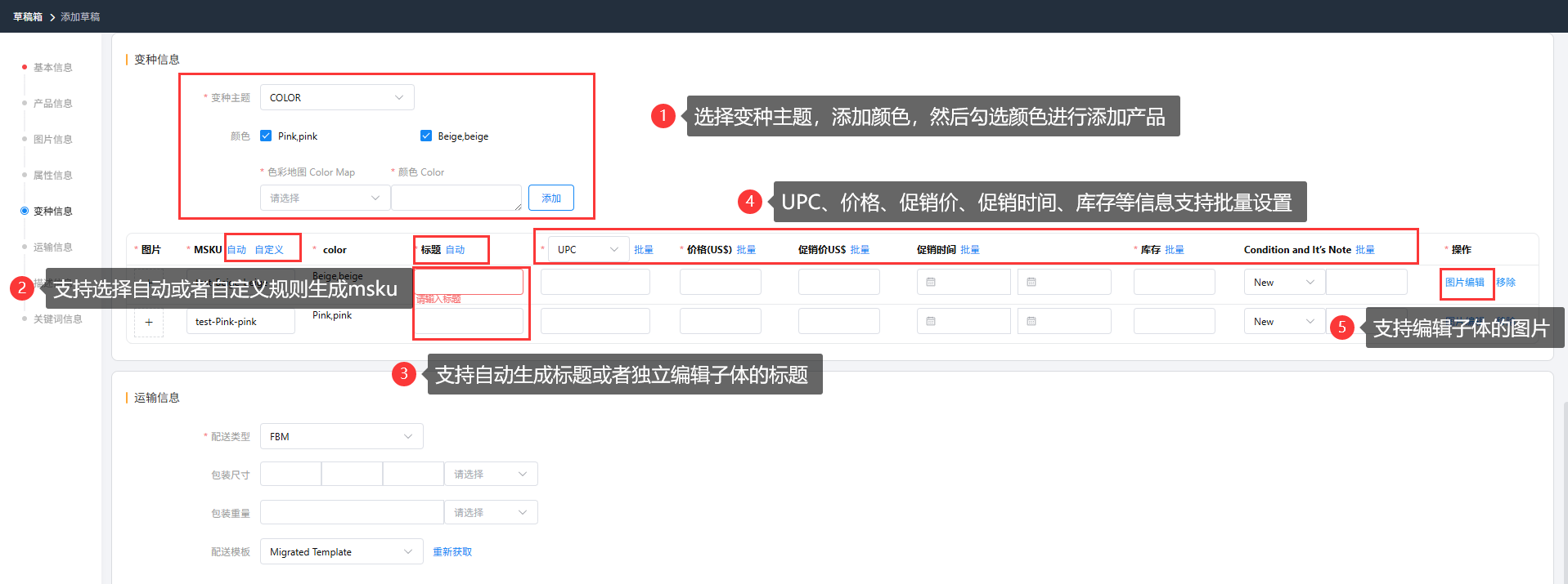 (3)变种属性:产品具体变种属性,比如颜色作为变种主题,可以自定义颜色属性,红色、蓝色、黄色等