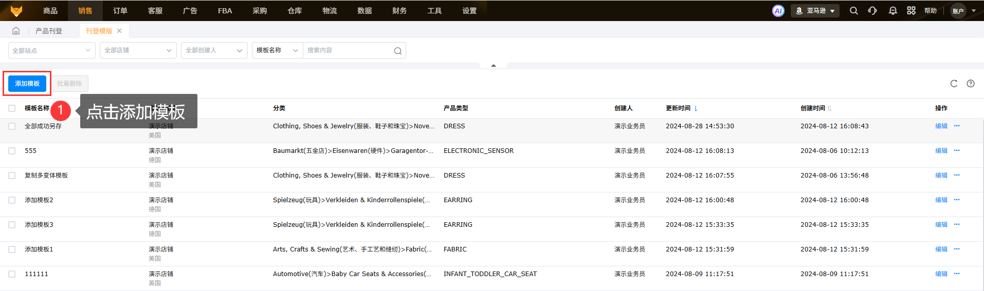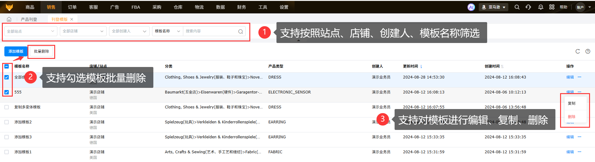 模板创建后会显示在刊登模板的列表,支持对已创建的刊登模板进行筛选、编辑、复制以及删除等操作。