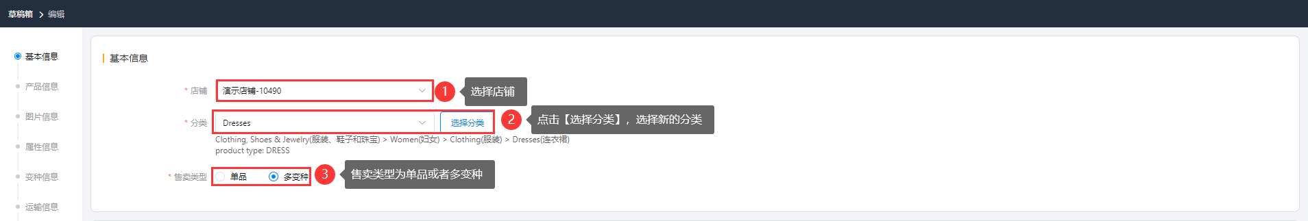 注意:部分产品类型不支持变种编辑,“售卖类型”无法选择“多变种”
