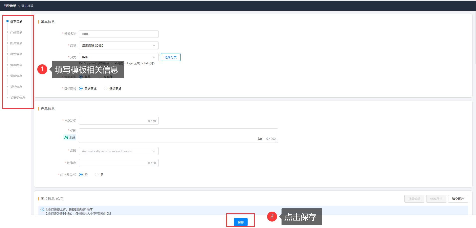 点击【刊登模板】-【添加模板】,填写基本信息、产品信息、图片信息、属性信息、变种信息、价格库存、运输信息、描述信息、关键词信息等,填写完成后点击保存即可存为模板。