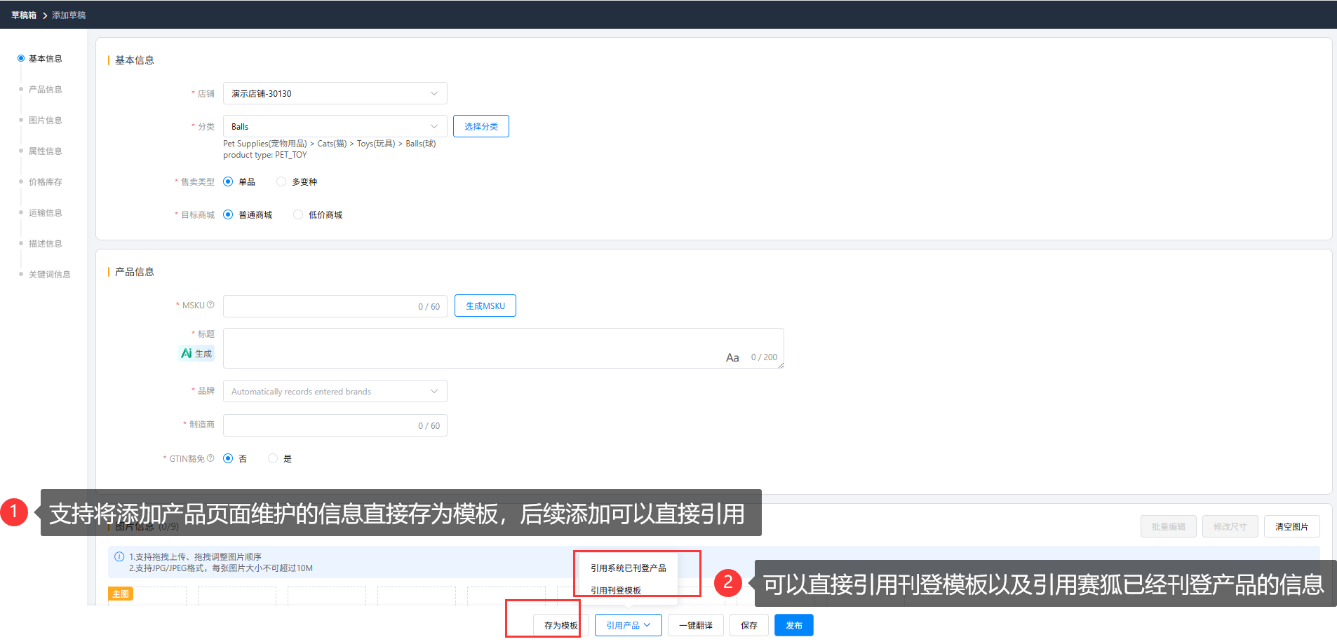 可以在添加产品的时候将填写好的信息保存为模板,也支持直接引用刊登模板或者引用系统已刊登产品。