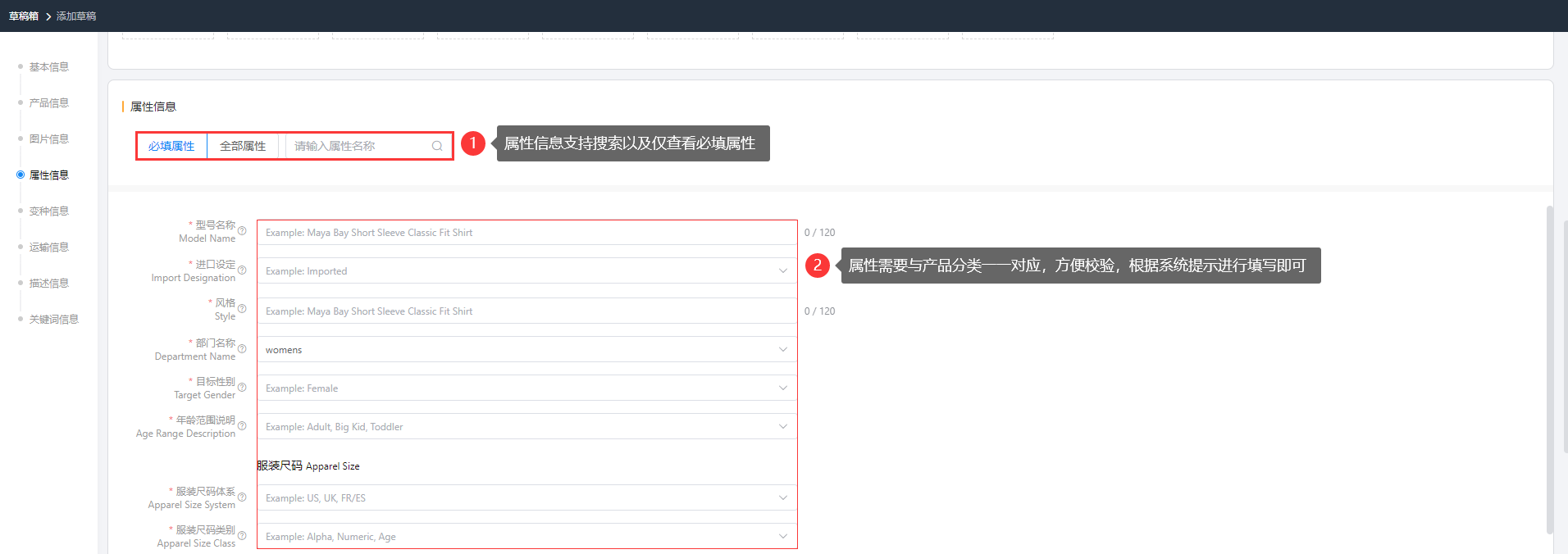 (1)属性信息支持搜索以及仅查看必填属性,属性需要与产品分类一一对应,方便校验,根据系统提示进行填写即可