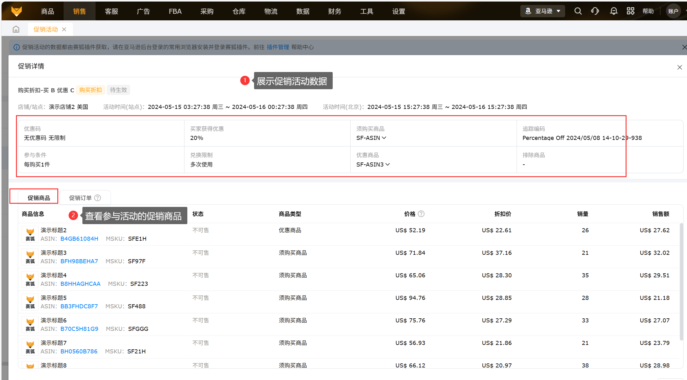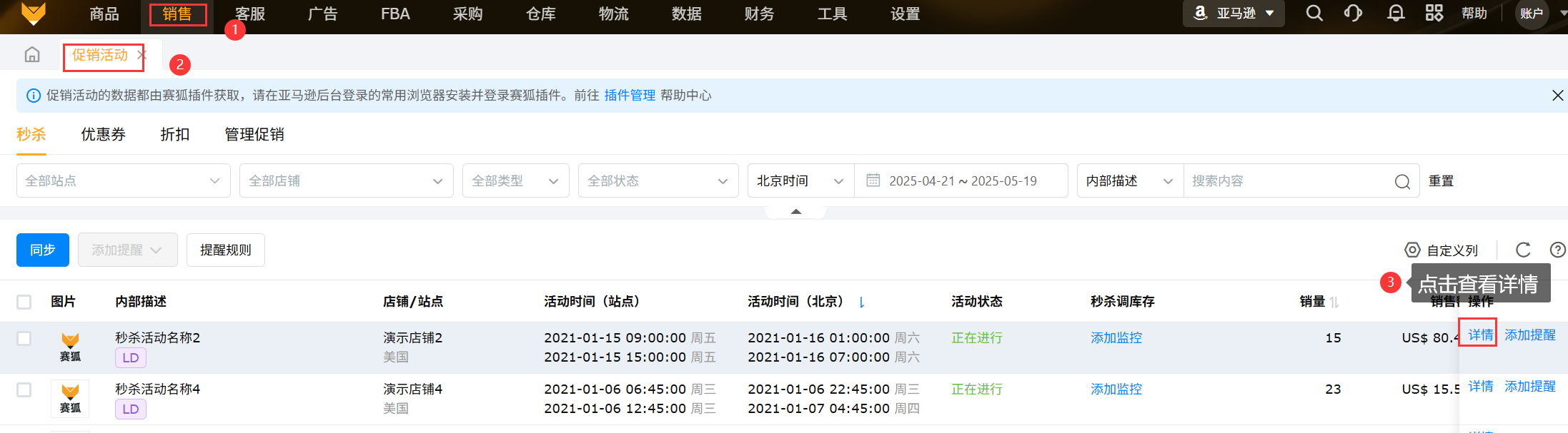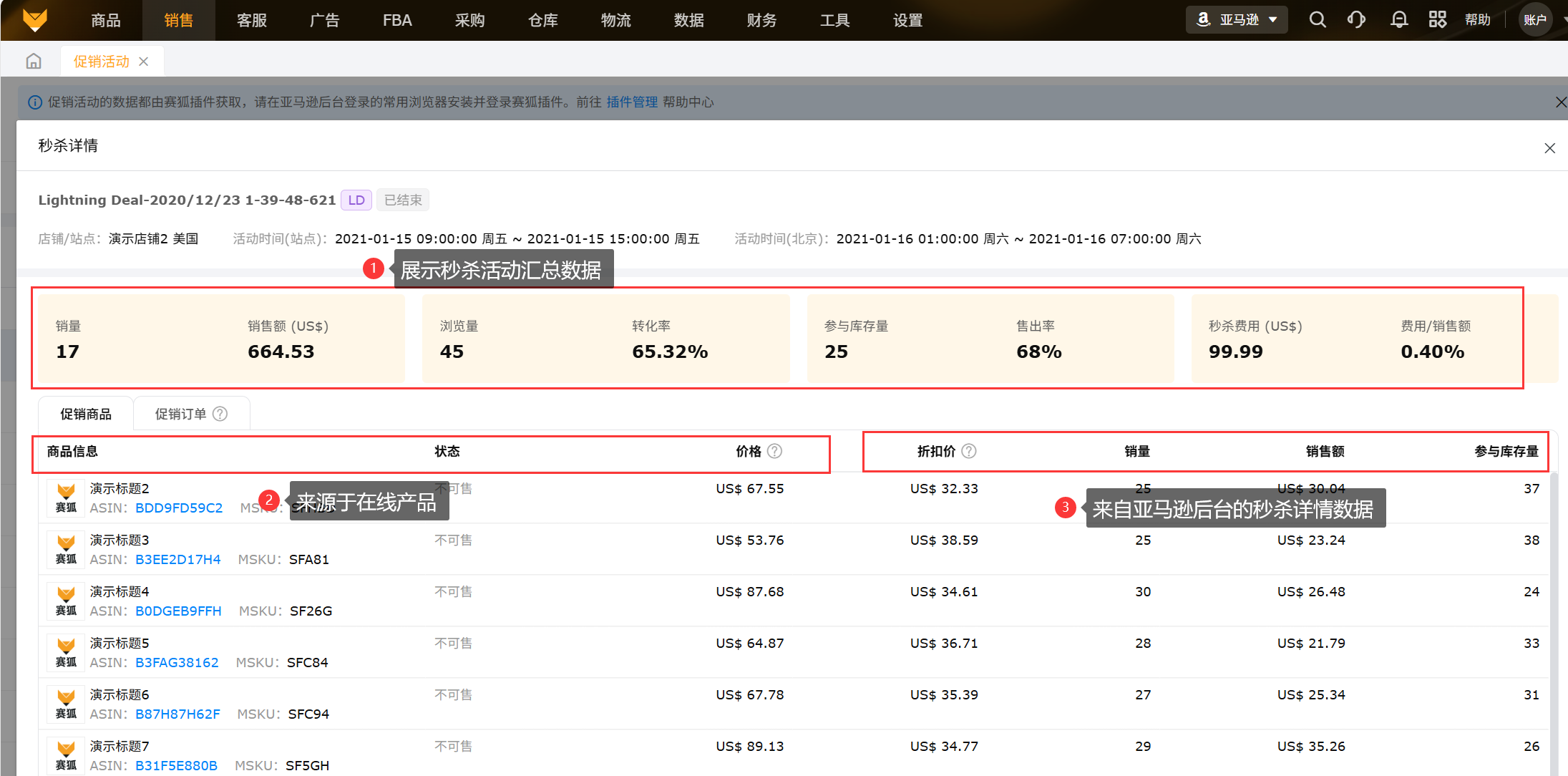 数据来源:促销活动的数据都由赛狐插件获取,需要保持亚马逊店铺和插件同时在线;